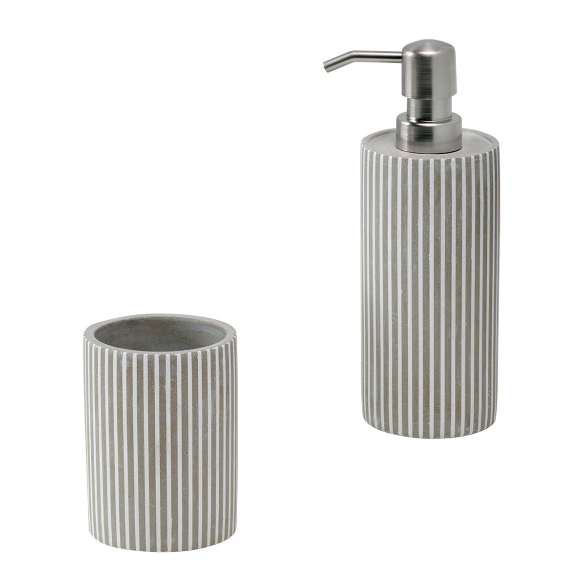 Ποτήρι για την οδοντόβουρτσα και δοχείο κρεμοσάπουνου από την εταιρεία Kentia. Είναι κατασκευασμένο από polyresin σε γκρι χρώμα με ανάγλυφες λεπτομέρειες. Ιδανικά για να οργανώσετε και να δώσετε στυλ στον νιπτήρα σας.