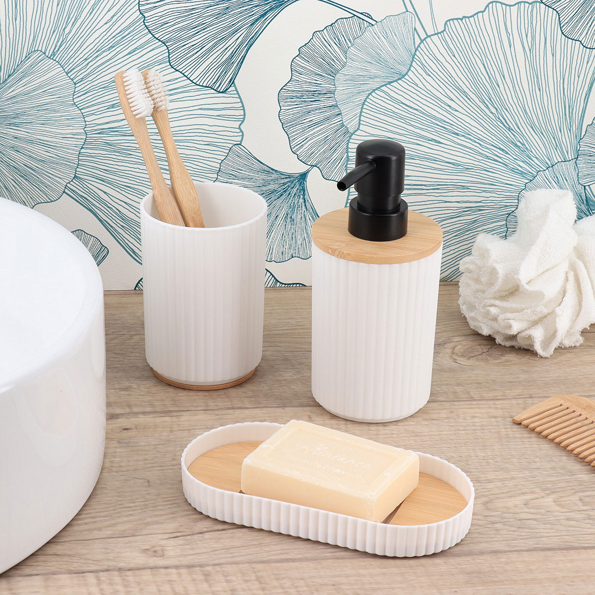 Σετ μπάνιου σε λευκό χρώμα, με μαύρες λεπτομέρειες. Είναι πλαστικά, κατασκευασμένα από 100% πολυπροπυλένιο, ενώ το καπάκι του ντισπένσερ είναι κατασκευασμένο από bamboo. Το σετ αποτελείται από 1 ντισπένσερ κρεμοσάπουνου, 1 ποτήρι οδοντόβουρτσας και 1 δισκάκι που μπορεί να χρησιμοποιηθεί για να τοποθετείτε τα αξεσουάρ ή σαν σαπουνοθήκη.