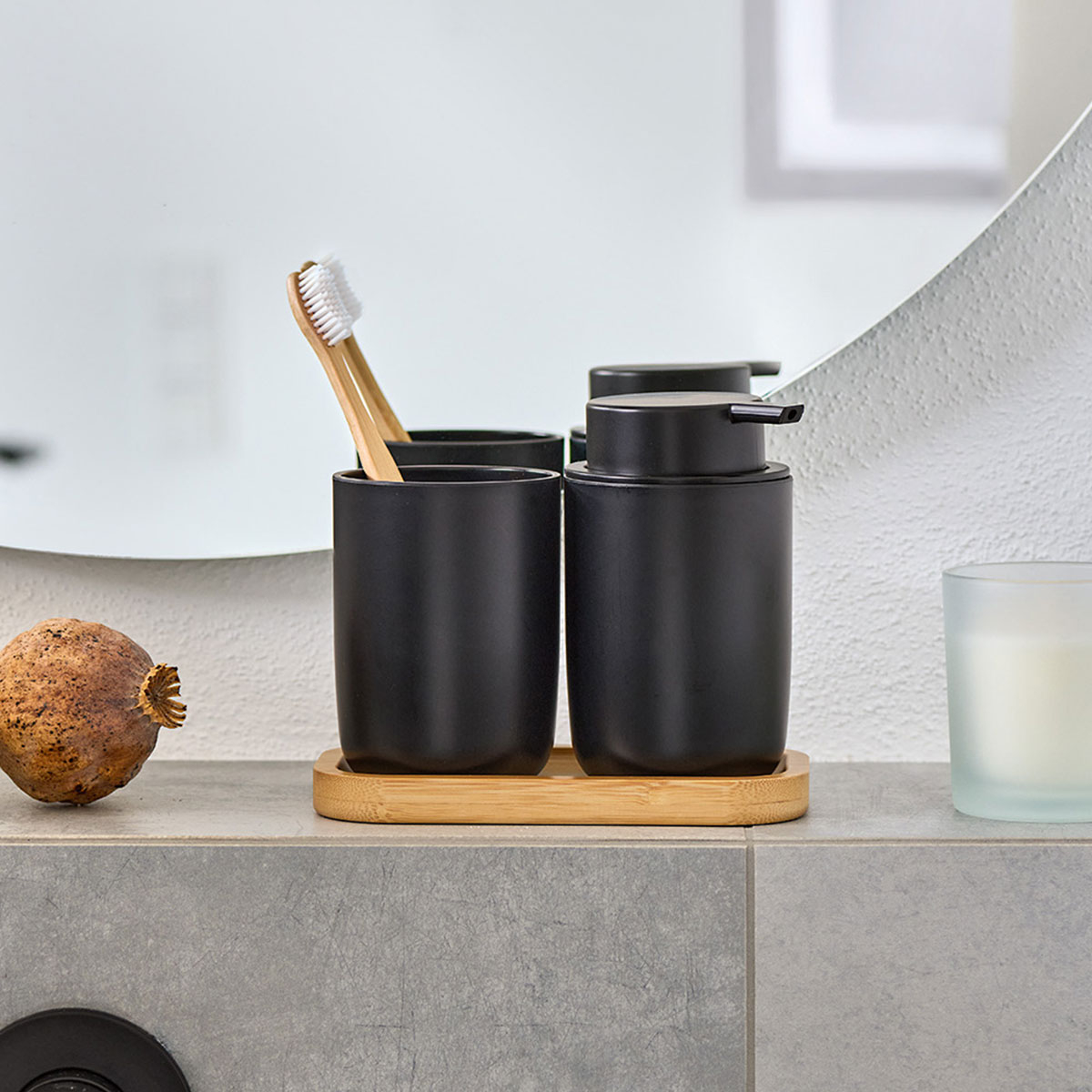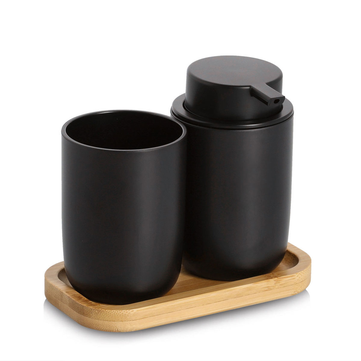 Αξεσουάρ μπάνιου σε σετ 3 τεμαχίων με μοντέρνα αισθητική. Το σετ περιλαμβάνει 1 δοχείο κρεμοσάπουνου με αντλία, 1 ποτήρι για οδοντόβουρτσες και 1 βάση από μπαμπού σε φυσική απόχρωση. Τα δοχεία είναι κατασκευασμένα από ανθεκτικό πλαστικό σε μαύρο χρώμα, ενώ η βάση από μπαμπού προσθέτει στυλ στον χώρο. Μια πρακτική και κομψή λύση για την καθημερινή οργάνωση του μπάνιου. Ιδανικό για να διατηρεί τον νιπτήρα οργανωμένο και καλαίσθητο. Η λιτή αισθητική του ταιριάζει εύκολα σε κάθε μπάνιο.