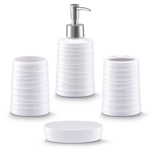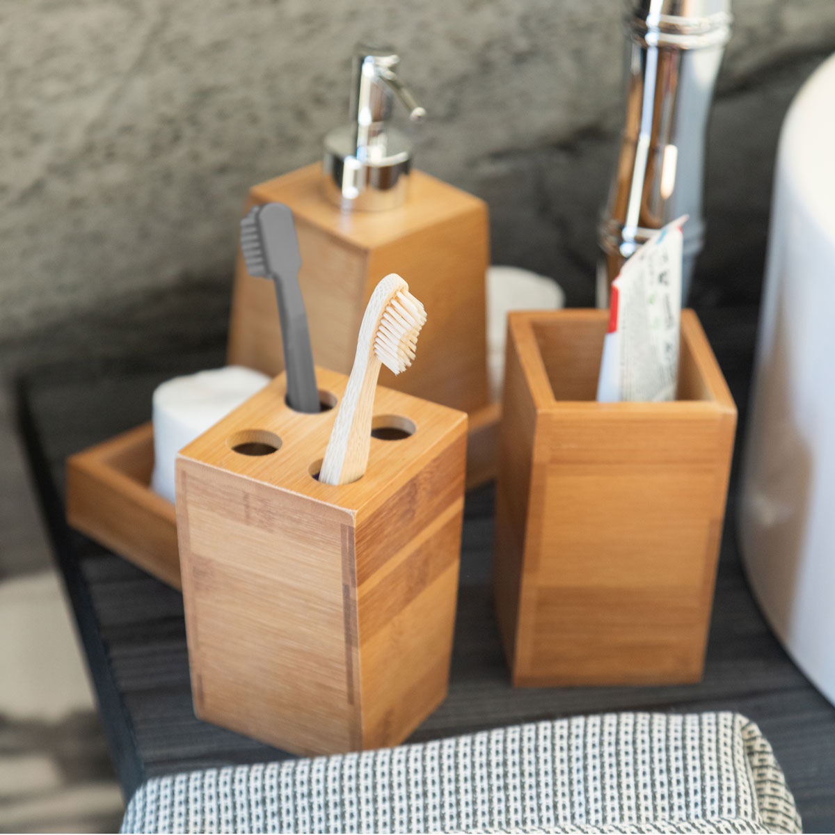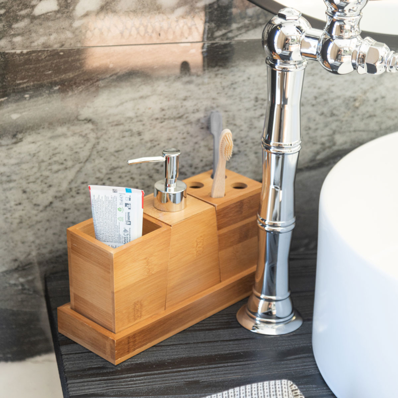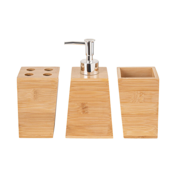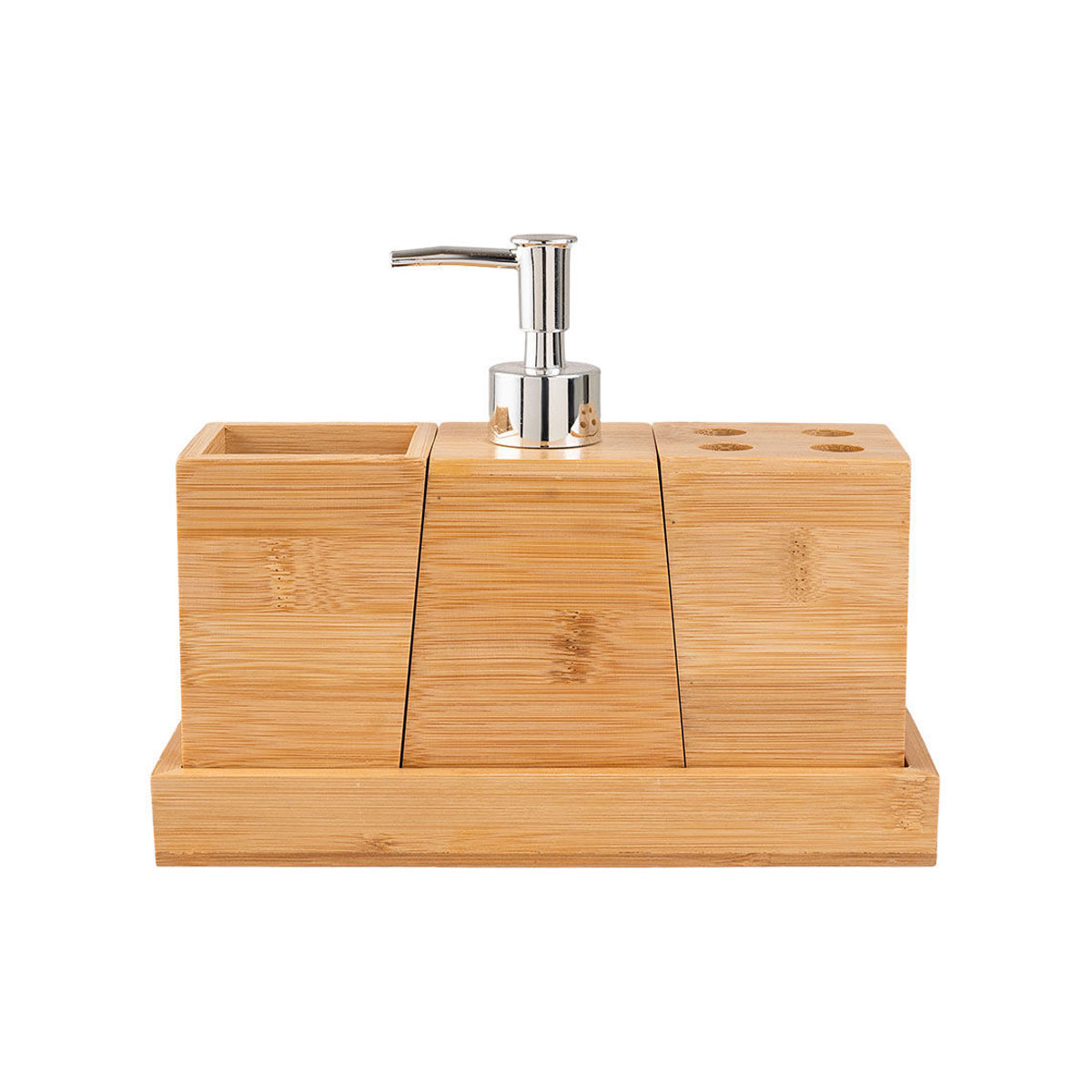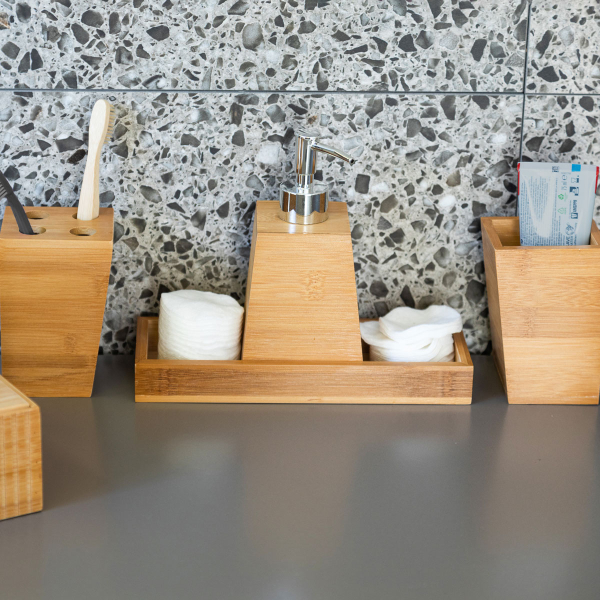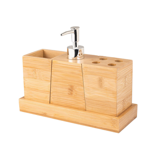 Αξεσουάρ μπάνιου σετ 4 τεμάχια από την εταιρεία εstia. Είναι κατασκευασμένο από υψηλής ποιότητας bamboo σε φυσικό χρώμα και μοντέρνο σχεδιασμό. Το σετ αποτελείται από 1 ντισπένσερ, 1 θήκη για οδοντόβουρτσες, 1 ποτηράκι και 1 βάση για να τοποθετείτε τα αξεσουάρ.