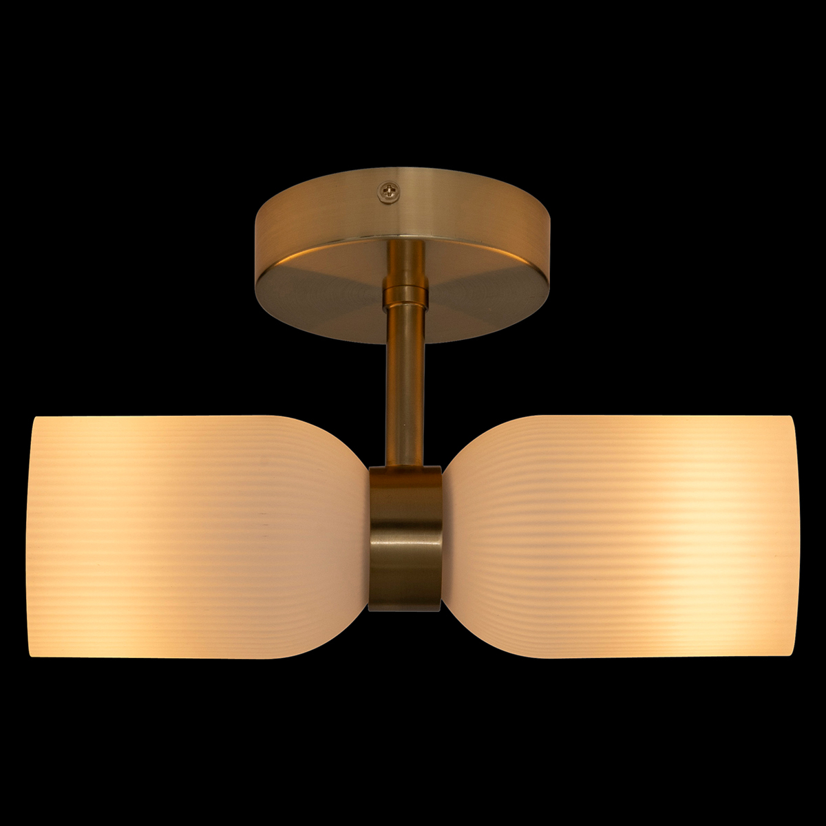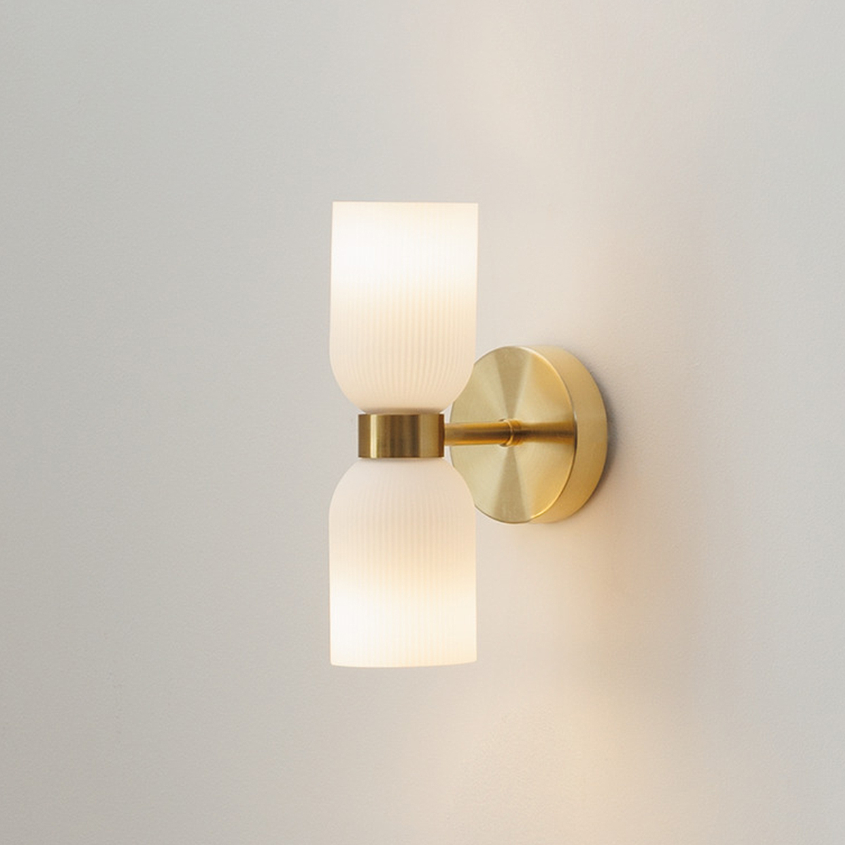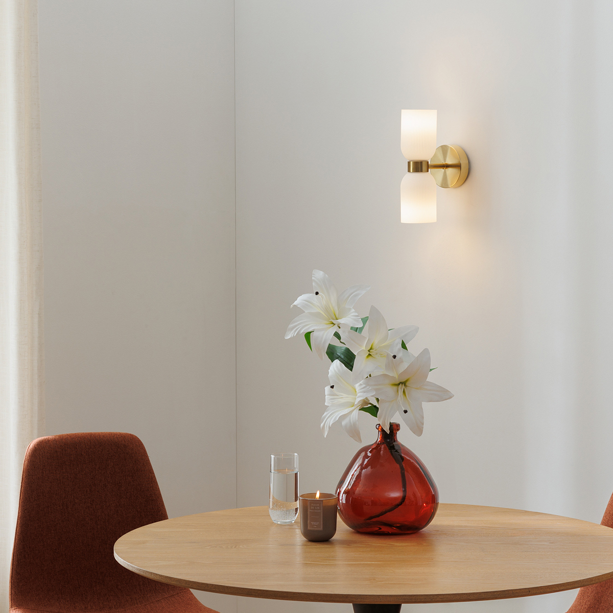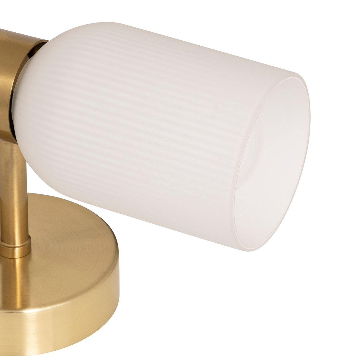 Απλίκα τοίχου με μοντέρνο σχεδιασμό. Είναι κατασκευασμένη από λευκό γυαλί με χρυσό μεταλλικό σκελετό. Είναι κατάλληλη για χρήση σε εσωτερικό χώρο με IP20. Τύπος ντουί: 2xE14 και θέσεις για 2 λαμπτήρες έως 25W (δεν συμπεριλαμβάνονται). Συνδυάστε τη με τα υπόλοιπα φωτιστικά της ίδιας συλλογής για ένα ολοκληρωμένο αποτέλεσμα στο χώρο σας.