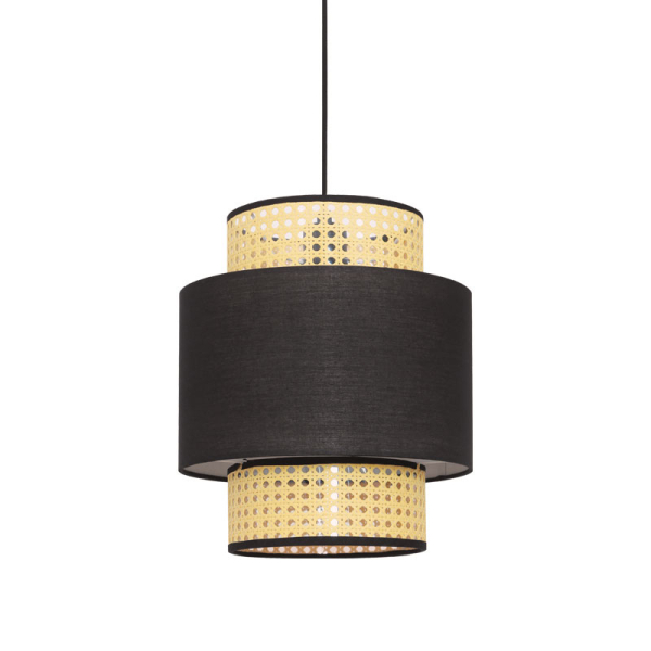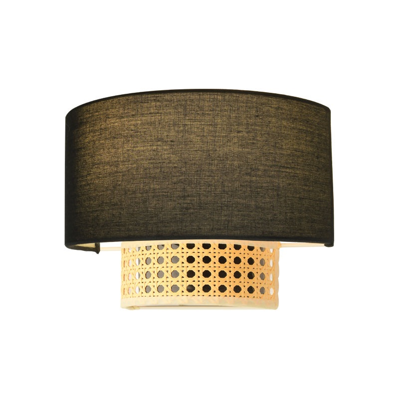 Απλίκα τοίχου της εταιρείας Aca Decor σε μοντέρνο στυλ. Είναι κατασκευασμένη από ύφασμα σε μαύρο χρώμα και ψάθα ρατάν. Εσωτερικά ο σκελετός είναι μεταλλικός. Τύπος ντουί: 1xE14 και θέση για 1 λαμπτήρα έως 10W (δεν συμπεριλαμβάνεται).