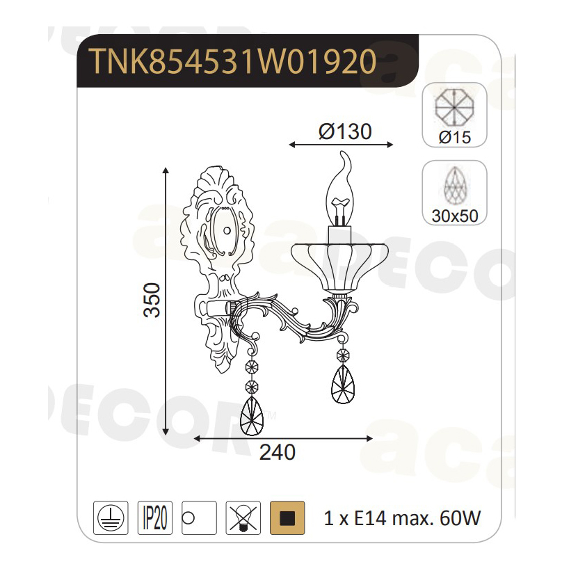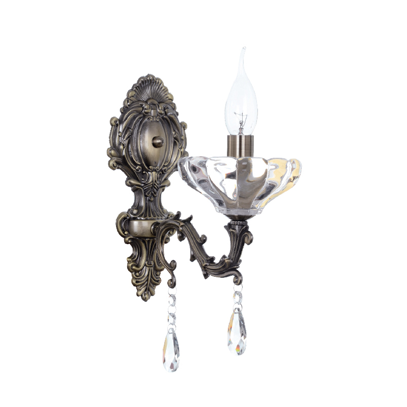 Απλίκα της εταιρείας Aca Decor σε vintage στυλ. Είναι κατασκευασμένη από μέταλλο σε αντικέ μπρονζέ απόχρωση και λεπτομέρειες από κρύσταλλο. Φέρει διακοσμητικά διαφανή κρυσταλλάκια διαστάσεων: 1,5εκ.Χ1,5εκ. & 3εκ.Χ5εκ. Τύπος ντουί: 1xE14 και θέση για 1 λαμπτήρα έως 60W (δεν συμπεριλαμβάνεται).