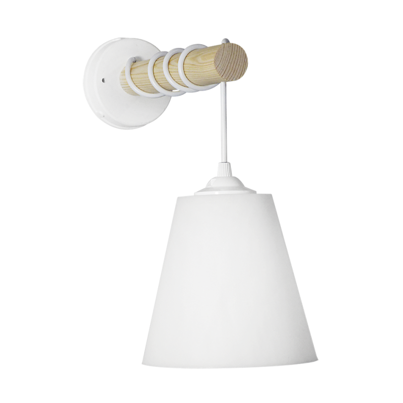 Απλίκα της εταιρείας Heronia σε μοντέρνο στυλ. Έχει πλαστικό καπέλο σε λευκό ματ χρώμα και ξύλινο σκελετό σε φυσική απόχρωση. Διαθέτει πλαστική βάση τοποθέτησης και καλώδιο σε λευκό χρώμα. Τύπος ντουί: 1xE27 και θέση για 1 λαμπτήρα **ΑΠΟΚΛΕΙΣΤΙΚΑ LED έως 10W** (δεν συμπεριλαμβάνεται). Δεν περιλαμβάνονται οι βίδες στερέωσης.