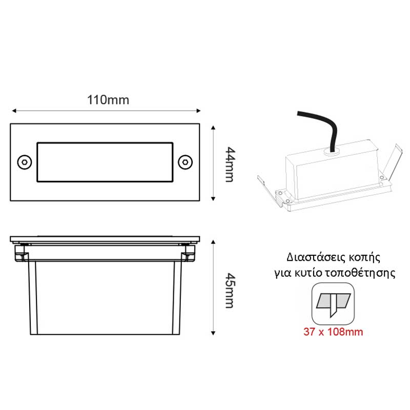 Χωνευτή απλίκα εξωτερικού χώρου από τη σειρά Pas της εταιρείας Aca Decor με προστασία από υγρασία και φθορές. Με ιδιαίτερα λεπτό σχεδιασμό και μίνιμαλ στυλ είναι ιδανική για να φωτίσετε και να διακοσμήσετε τον κήπο και τους εξωτερικούς χώρους του σπιτιού ή του εξοχικού σας. Διαθέτει κυτίο τοποθέτησης. Οι διαστάσεις κοπής για την εισαγωγή του κυτίου είναι 10.8εκ.Μx3.7εκ.Π. Η απλίκα είναι κατασκευασμένη από ενισχυμένο θερμοπλαστικό υλικό ABS και άθραυστο πολυκαρβονικό υλικό (PC) σε λευκό χρώμα, ενώ έχει οπάλ PC κάλυμμα. Διαθέτει ενσωματωμένη γραμμική πλακέτα SMD LED 2Watt και 230V AC (χωρίς εξωτερικό τροφοδοτικό), που παράγει λευκό-θερμό φως θερμοκρασίας 3000Κ και φωτεινότητας 90LM. Έχει δέσμη φωτισμού 120 μοιρών και διάρκεια ζωής 30000 ώρες. Είναι ιδανική για τους εξωτερικούς χώρους σε όλες τις περιοχές καθώς έχει τις εξής ιδιότητες: 1) είναι εξαιρετικά ανθεκτική στις φθορές με βαθμό μηχανικής κρούσης IK08, 2) έχει προστασία από υγρασία και σκόνη με βαθμό στεγανότητας IP54, 3) με ειδική προστασία απέναντι στην UV ακτινοβολία και 4) με δυνατότητα λειτουργίας της σε θερμοκρασίες από -15οC έως +50οC. Εγγύηση λαμπτήρα 2 χρόνια. Μετά το πέρας της εγγύησης, ενδεχόμενες επισκευές πραγματοποιούνται κατόπιν επικοινωνίας με τo Spitishop. Tο προϊόν θα αποσταλεί στον επίσημο προμηθευτή, ο οποίος καθορίζει και το κόστος επισκευής. Περιλαμβάνονται ανοξείδωτες βίδες εγκατάστασης.