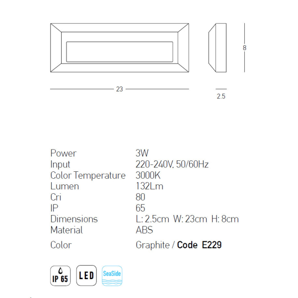 Απλίκα εξωτερικού χώρου από την εταιρεία Zambelis με μίνιμαλ σχεδιασμό. Είναι κατασκευασμένη από πλαστικό ABS σε γκρι χρώμα. Έχει βαθμό στεγανότητας IP65, που την καθιστά κατάλληλη για τοποθέτηση και σε εξωτερικό χώρο. Διαθέτει ενσωματωμένη πλακέτα Led με ισχύ 3W, θερμού λευκού φωτισμού 3000K και φωτεινότητας 132Lm. Ιδανική για παραθαλάσσια μέρη. Εγγύηση 2 χρόνια. Μετά το πέρας της εγγύησης, ενδεχόμενες επισκευές πραγματοποιούνται κατόπιν επικοινωνίας με τo Spitishop. Tο προϊόν θα αποσταλεί στον επίσημο προμηθευτή, ο οποίος καθορίζει και το κόστος επισκευής. Τάση: 220-240Volt.