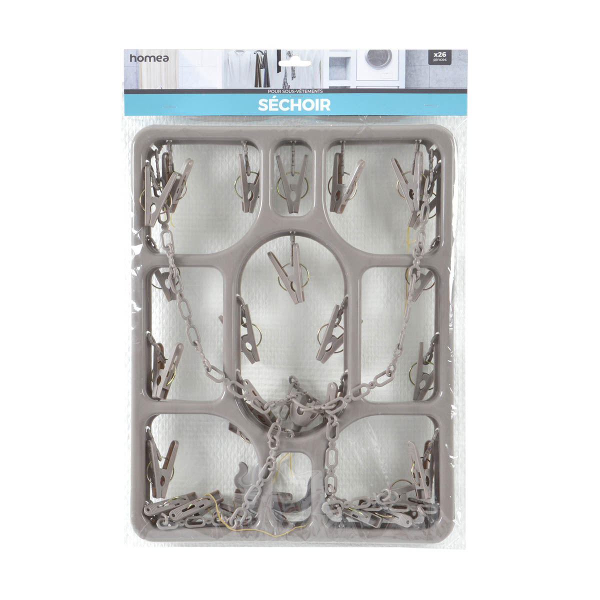 Απλώστρα μικρών ρούχων με 26 μανταλάκια. Είναι κατασκευασμένη από πλαστικό υλικό σε γκρι χρώμα. Διαθέτει γάντζο και μπορεί να τοποθετηθεί στα σχοινιά απλώματος ή στην απλώστρα. Είναι πτυσσόμενη για εύκολη αποθήκευση όταν δεν χρησιμοποιείται. Ιδανική για μικρά ρούχα όπως κάλτσες, εσώρουχα κλπ. και για μικρούς χώρους.