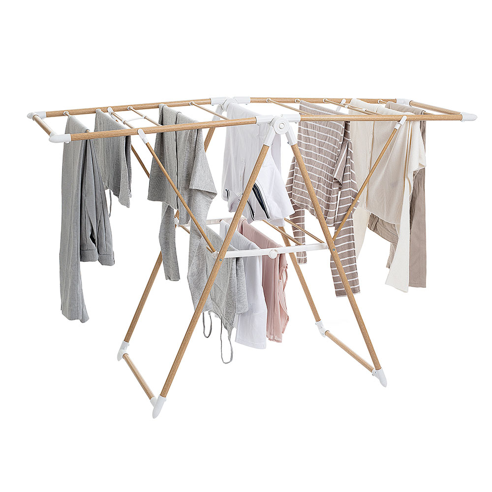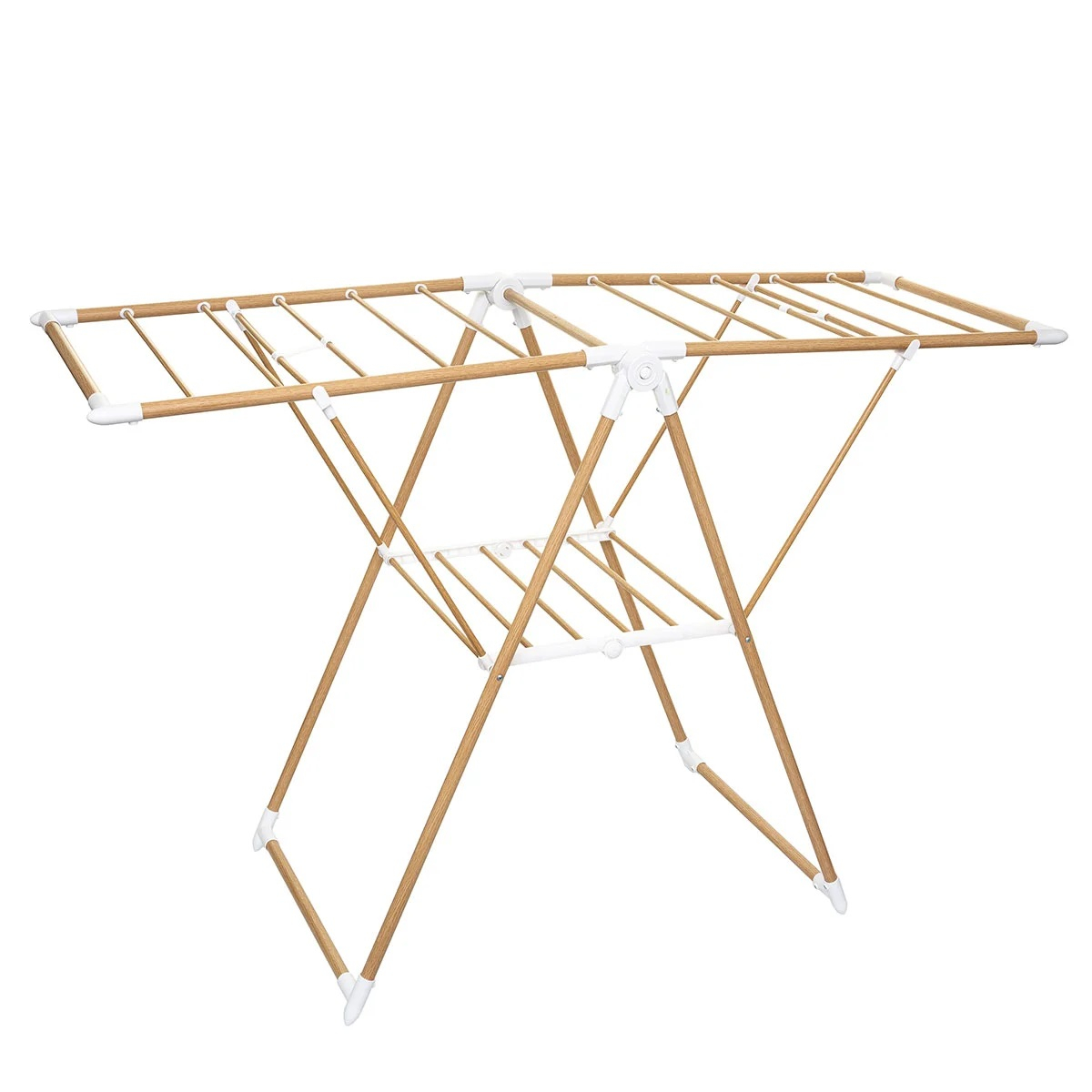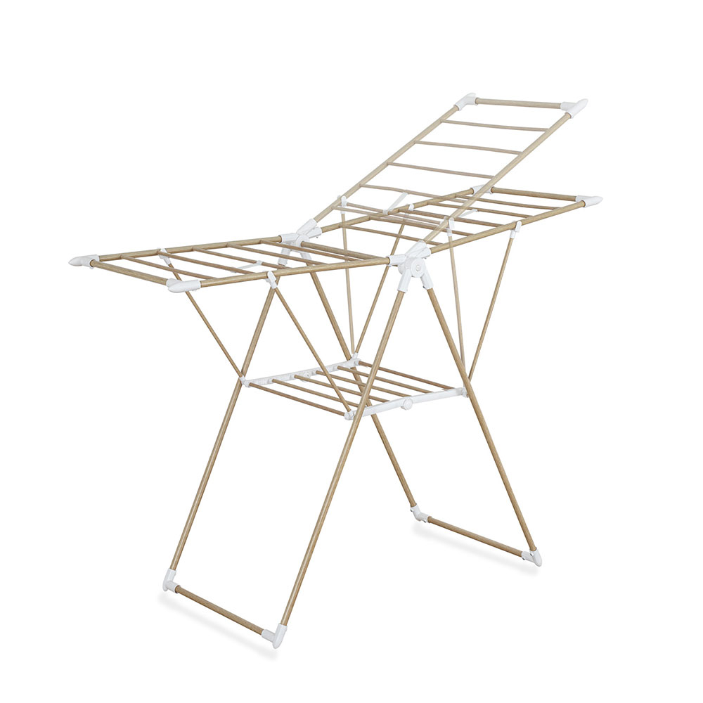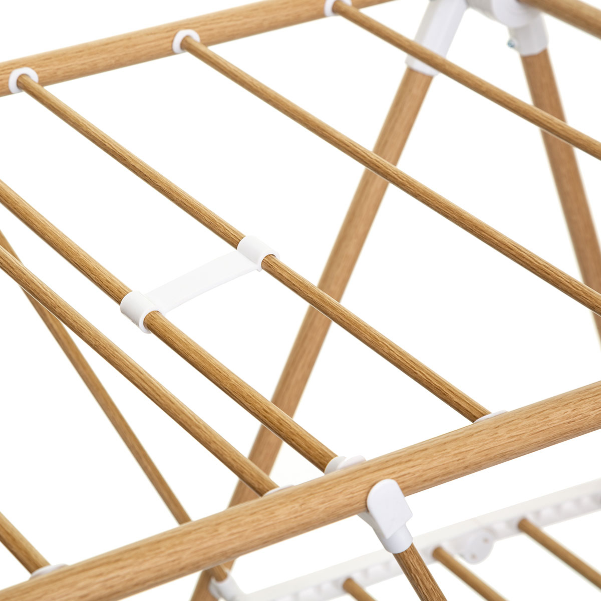 Πτυσσόμενη απλώστρα δαπέδου, κατασκευασμένη από μεταλλικό και πλαστικό υλικό. Έχει μπεζ χρώμα και εφέ ξύλου. Διπλώνει ώστε να αποθηκεύεται εύκολα όταν δεν την χρησιμοποιείτε. Μέγιστο βάρος αντοχής: 20kg. Το συνολικό μήκος από τις ράγες αντιστοιχεί σε 13 μέτρα απλώματος.