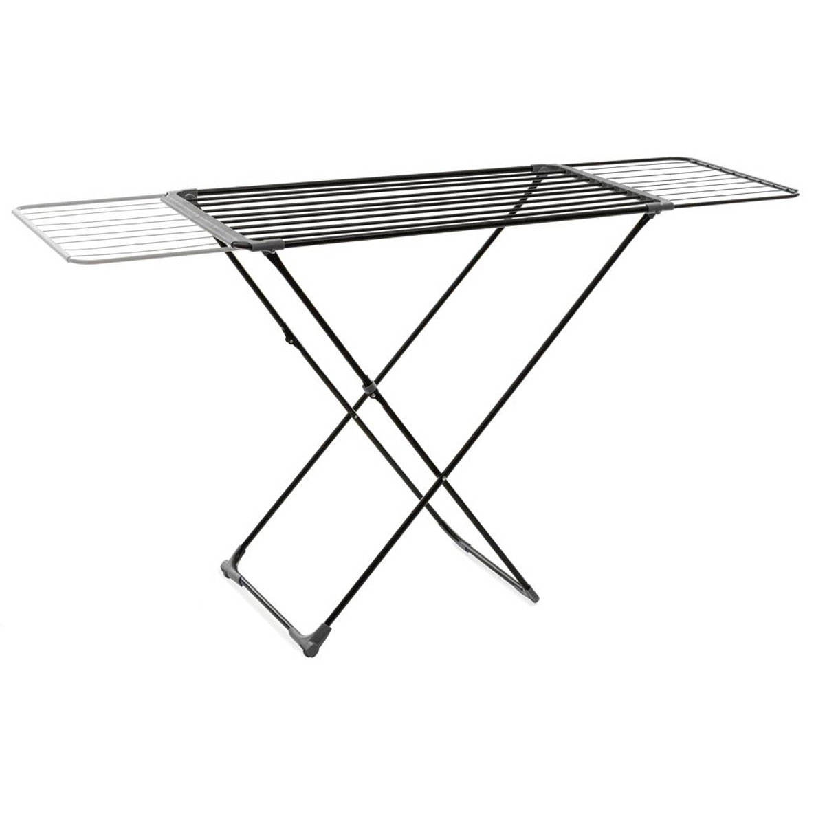 Επεκτεινόμενη απλώστρα δαπέδου κατασκευασμένη από μεταλλικό υλικό σε μαύρο χρώμα. Διπλώνει ώστε να αποθηκεύεται εύκολα όταν δεν την χρησιμοποιείτε. Το συνολικό μήκος από τις ράγες αντιστοιχεί σε 20 μέτρα απλώματος.