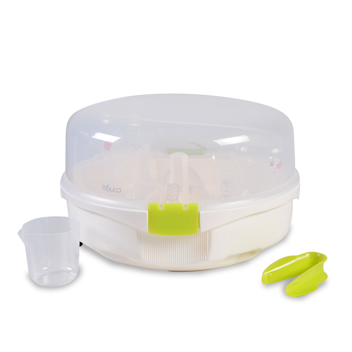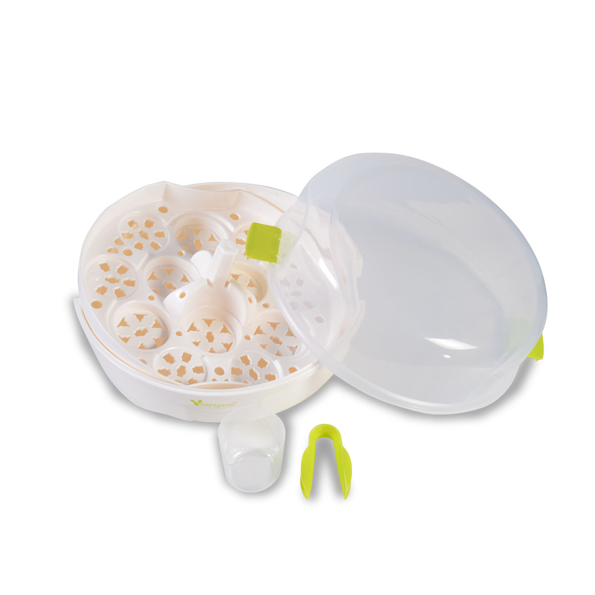 Αποστειρωτής μπιμπερό και αξεσουάρ της εταρείας Cangaroo. Είναι κατασκευασμένος από πλαστικό υλικό σε λευκό χρώμα με πράσινες λεπτομέρειες. Απλό στην χρήση καθώς τοποθετείτε τα μπιμπερό και τα αξεσουάρ στον αποστειρωτή, ρίχνετε νερό, κλείνετε το καπάκι και το τοποθετείτε στον φούρνο μικροκυμάτων. Κατάλληλος για χρήση σε φούρνο μικροκυμάτων με ελάχιστη ισχύ 750W και μέγιστο χρόνο αποστείρωσης 8 λεπτά. Χωράει 5 μπιμπερό με μέγιστο ύψος 15.5cm και τα αξεσουάρ τους όπως πιπίλες και θηλές. Χάρη στο συμπαγές του μέγεθος μπορείτε να τον μεταφέρετε εύκολα. Περιλαμβάνει τσιμπίδα για να πιάνετε τα μπιμπερό χωρίς να καίγεστε και δοσομετρητή νερού. Πλένεται στο πλυντήριο πιάτων.