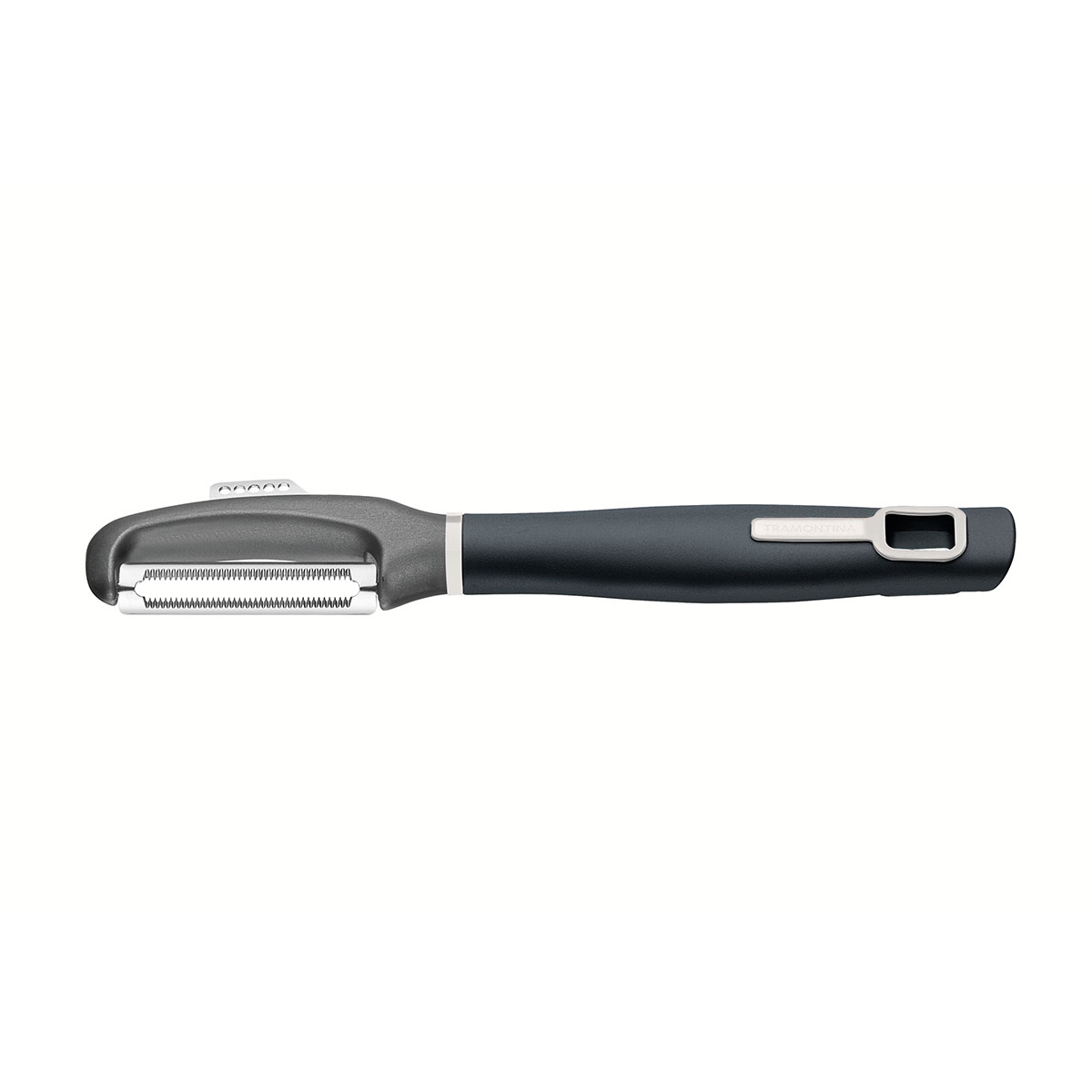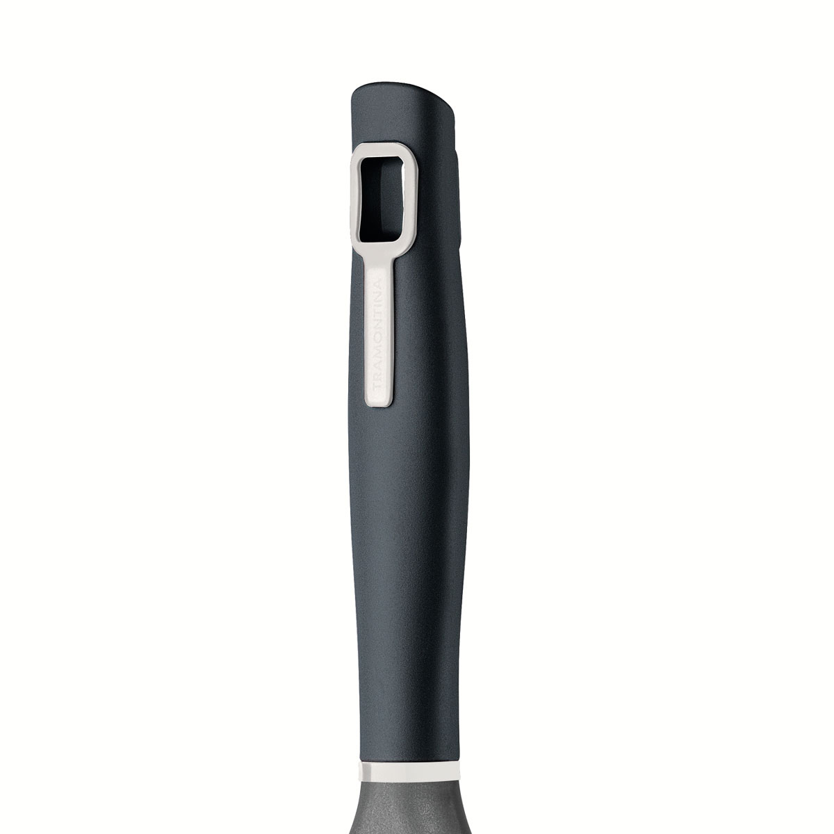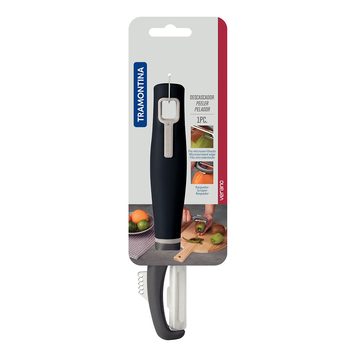 Αποφλοιωτής-πίλερ από την σειρά Cutelaria της εταιρείας Tramontina. Η λεπίδα είναι κατασκευασμένη από ανοξείδωτο ατσάλι με οδοντωτή άκρη ενώ η λαβή είναι από πολυπροπυλένιο σε μαύρο και γκρι χρώμα. Διαθέτει τρύπα για να κρεμιέται. Συνδυάστε τον με τα υπόλοιπα είδη σερβιρίσματος και εργαλεία κουζίνας της ίδιας συλλογής.
