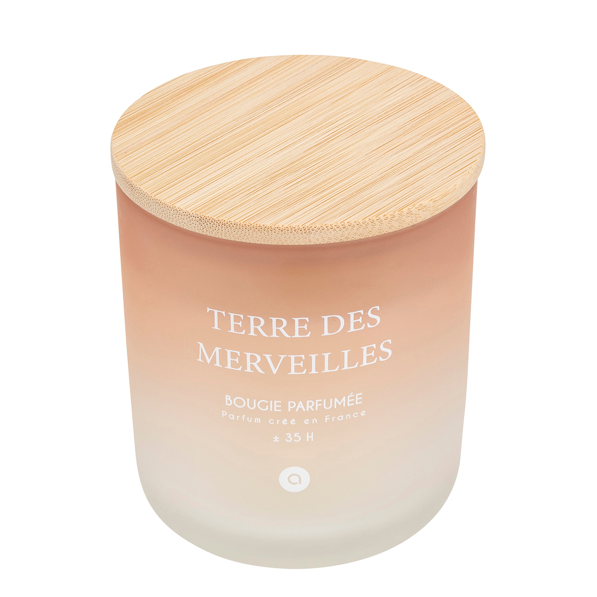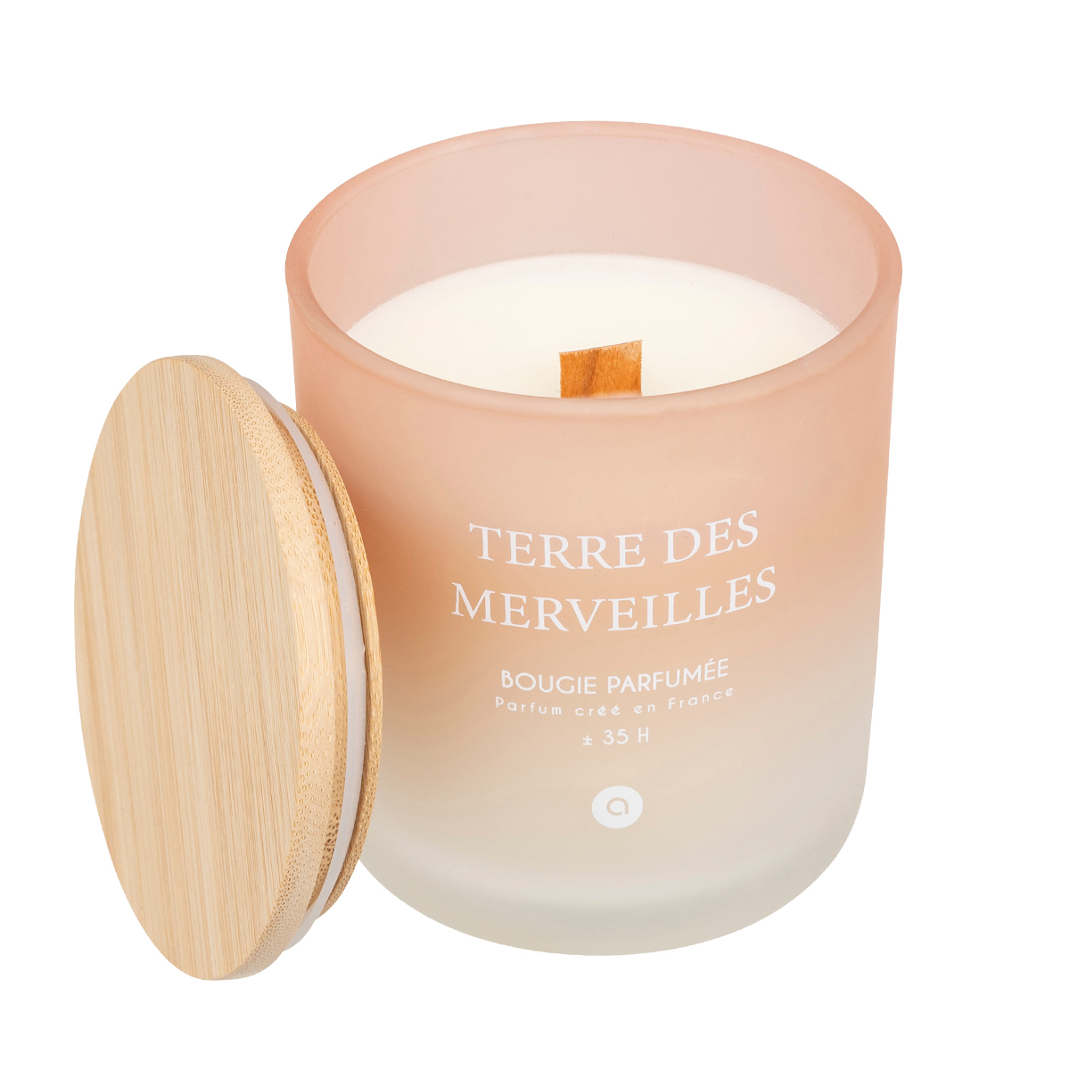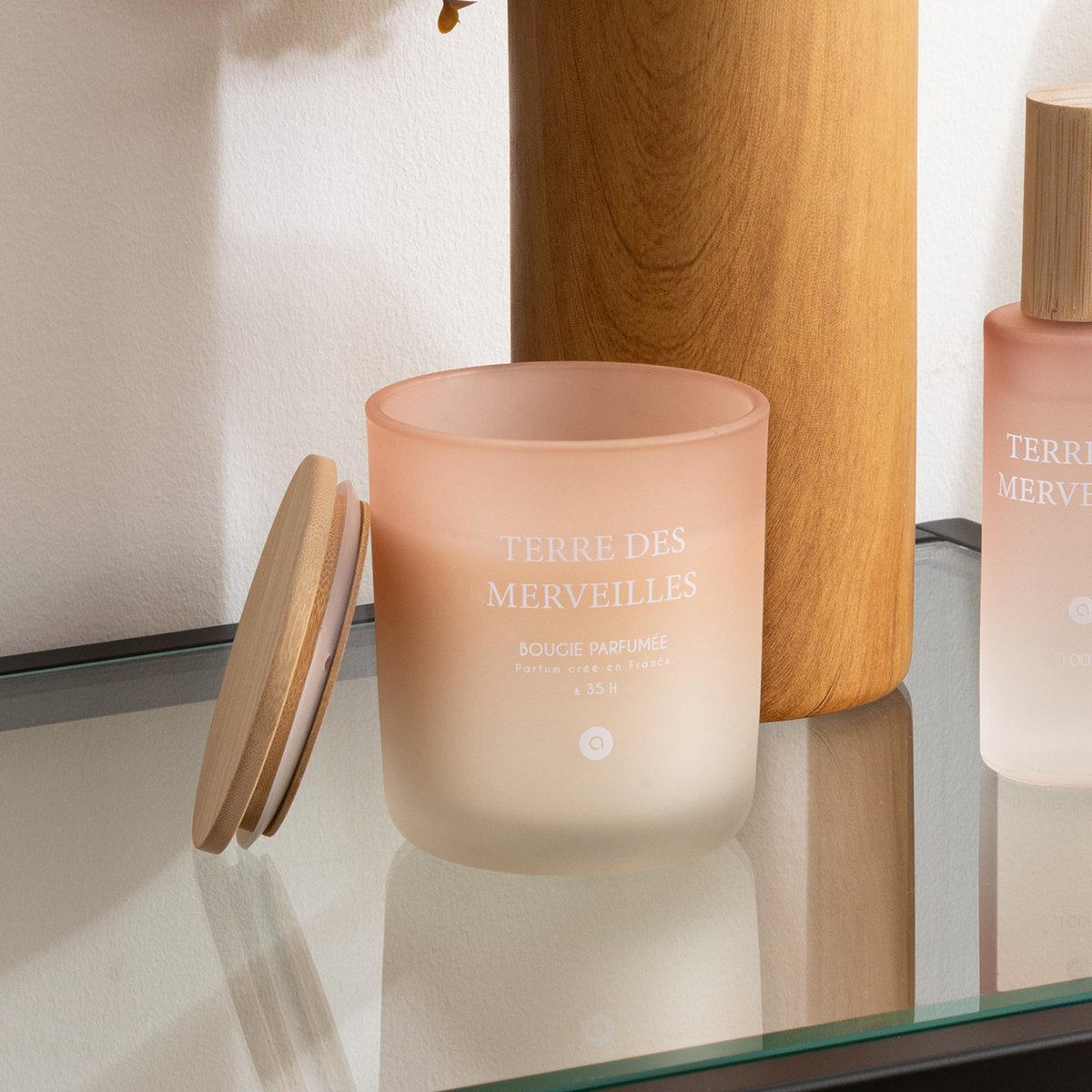 Κερί αρωματικό Terre Des Merveilles με βάρος 255gr. Το άρωμα Terre Des Merveilles είναι ένα εκλεπτυσμένο άρωμα που περιλαμβάνει ξυλώδη, γήινα και ελαφρώς γλυκά αρώματα, τα οποία μεταφέρουν την αίσθηση ενός ταξιδιού στη φύση, με νότες από μπαχαρικά και λευκά λουλούδια. Είναι τοποθετημένο σε γυάλινο βαζάκι με ξύλινο καπάκι για να διατηρείτε το άρωμά του αναλλοίωτο όταν δεν το χρησιμοποιείτε. Ιδανικό κερί για να δημιουργήσει μια χαλαρωτική και ζεστή ατμόσφαιρα στο χώρο σας. Συνδυάστε το με τα υπόλοιπα είδη της ίδιας συλλογής για ένα ολοκληρωμένο αποτέλεσμα στο χώρο σας. Διάρκεια καύσης: 35 ώρες.
