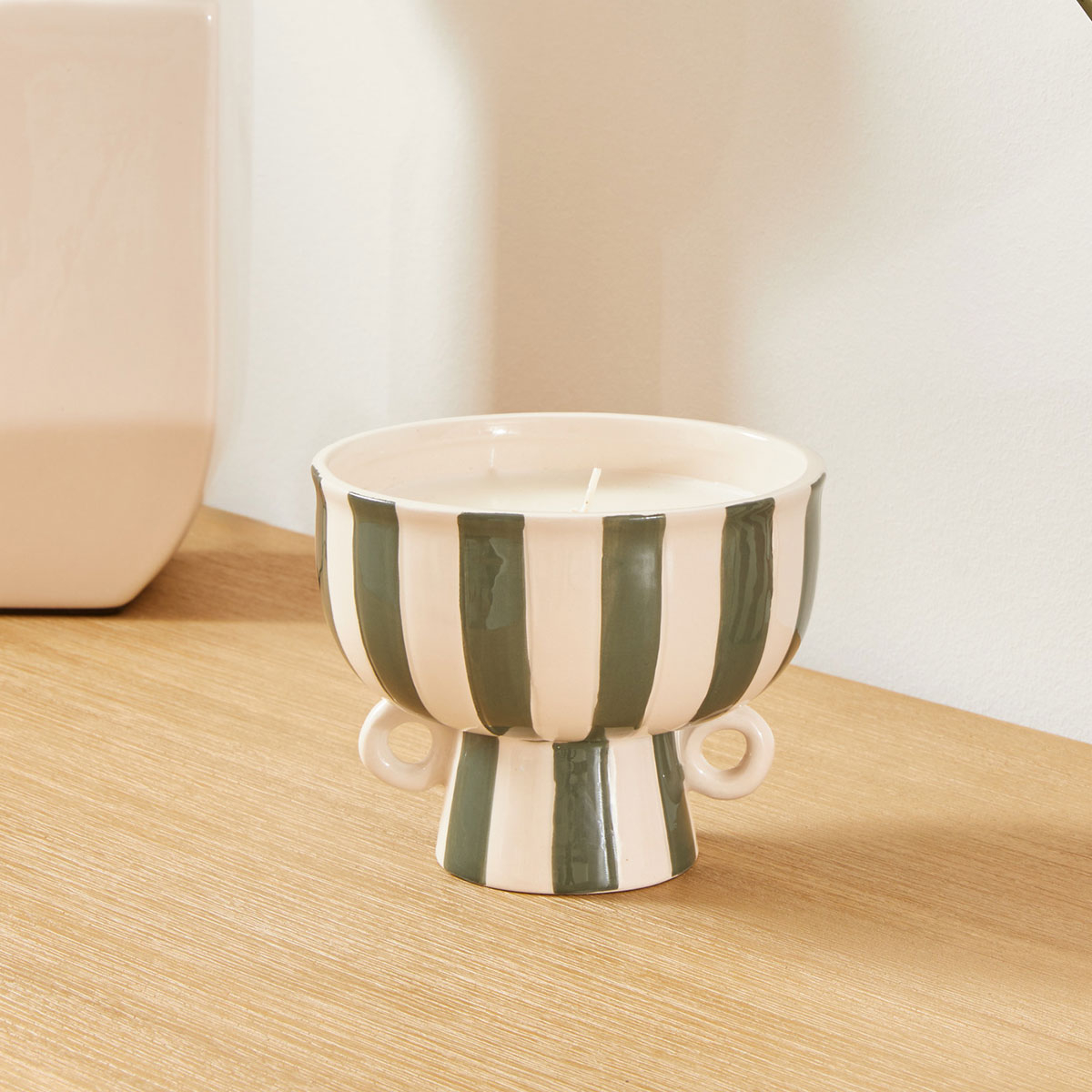 Κερί αρωματικό που θα ανανεώσει εσάς και την ατμόσφαιρα του χώρου σας. Έχει άρωμα γιασεμί που αποπνέει λουλουδένιο, γλυκό και αισθησιακό άρωμα. Δημιουργεί ατμόσφαιρα χαλάρωσης και ρομαντισμού, χαρίζοντας φρεσκάδα, ηρεμία και φυσική κομψότητα στον χώρο. Eίναι τοποθετημένο σε κεραμικό βαζάκι με πράσινο - λευκό ριγέ σχέδιο και βάρος 310gr, ενώ έχει 2 φιτίλια. Ανάψτε το κερί και δημιουργήστε μία ευχάριστη και χαλαρή ατμόσφαιρα στον χώρο σας, απολαμβάνοντας την αίσθηση ζεστασιάς που προσφέρει.