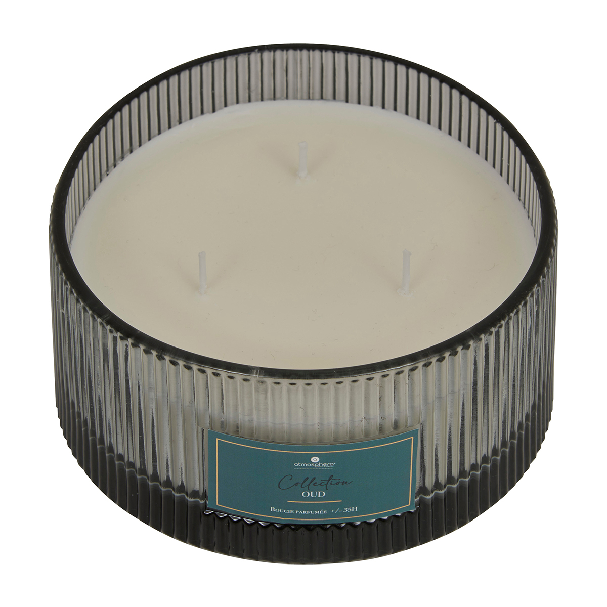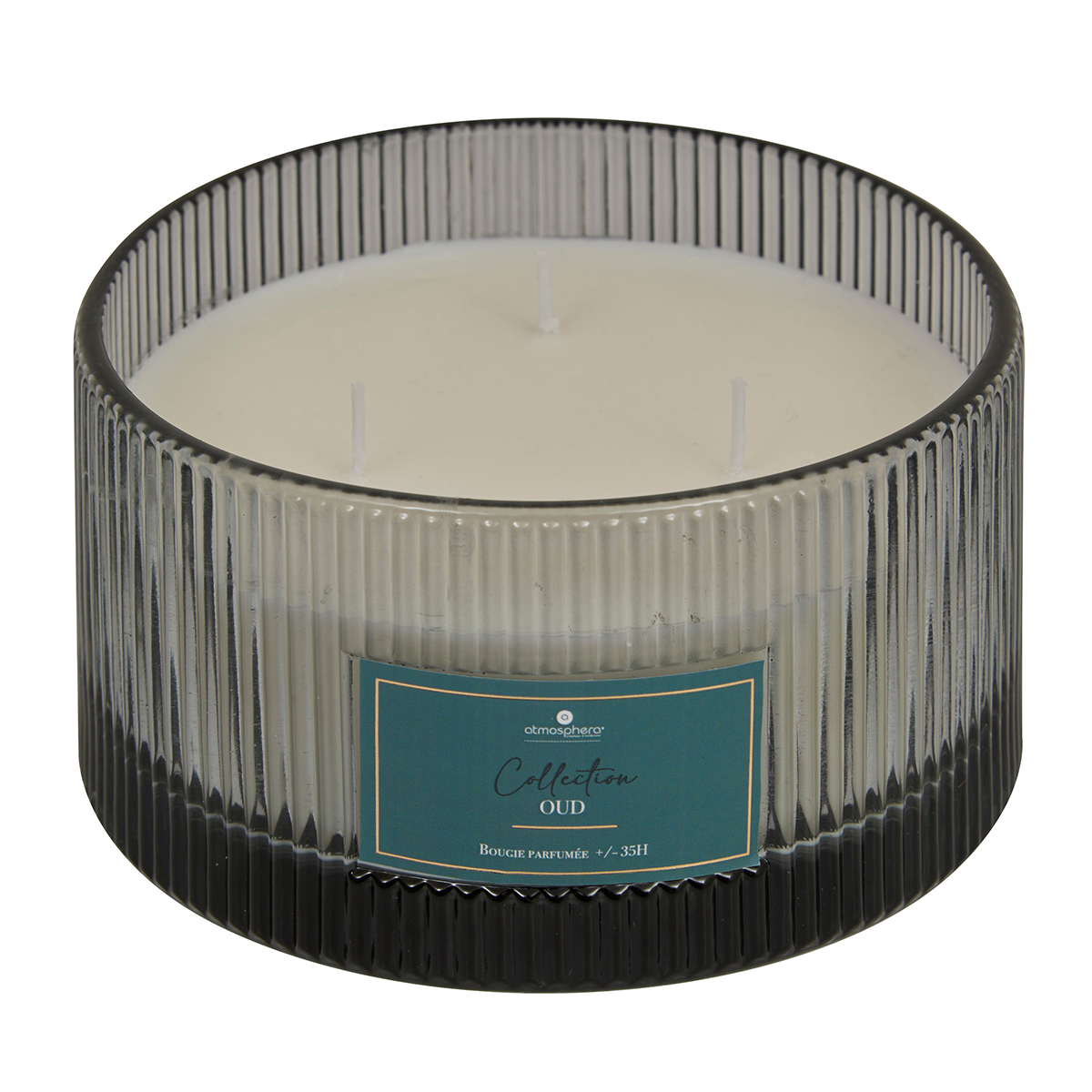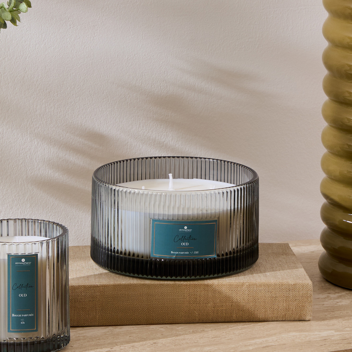 Κερί αρωματικό που θα ανανεώσει εσάς και την ατμόσφαιρα του χώρου σας. Είναι ένα ξυλώδες άρωμα με το συστατικό oud που αντλεί την έμπνευσή του από τον αρωματικό κόσμο της Μέσης Ανατολής, τοποθετημένο σε γυάλινο βαζάκι με γκρι απόχρωση. Διαθέτει 3 φιτίλια και η διάρκεια καύση είναι περίπου 35 ώρες.