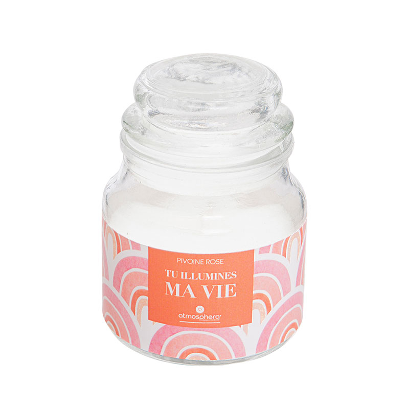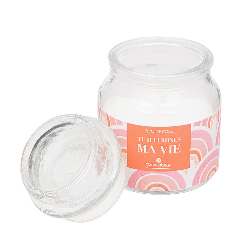 Κερί αρωματικό που θα χαρίσει άρωμα από ροζ παιώνια στο χώρο σας. Είναι τοποθετημένο σε διάφανο γυάλινο βαζάκι με καπάκι και πολύχρωμες λεπτομέρειες. Έχει βάρος 65gr και μέγιστο χρόνο καύσης 12 ώρες. Ανάψτε το κερί και δημιουργήστε μία ευχάριστη και χαλαρή ατμόσφαιρα στον χώρο σας, απολαμβάνοντας την αίσθηση ζεστασιάς που προσφέρει.