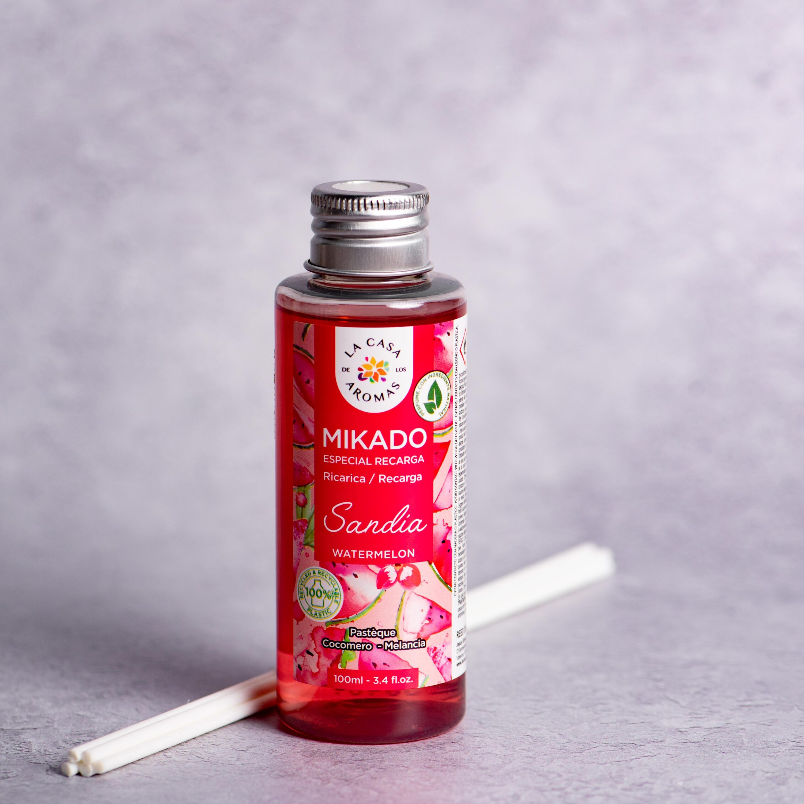 Αρωματικό χώρου χωρητικότητας 100ml με στικς από την εταιρεία La Casa de los Aromas by Corona di Fiori. Με φρουτώδες άρωμα καρπούζι. Κάθε εβδομάδα μπορείτε να αναποδογυρίσετε τα στικς για να ενισχύσετε την ένταση του αρώματος. Αποφύγετε να τα τοποθετείτε κοντά σε κάποια πηγή θερμότητας, ώστε να μην σας τελειώνει γρήγορα το υγρό. Ιδανικό για μια γλυκιά και φρέσκια ατμόσφαιρα σε όλους τους χώρους του σπιτιού.