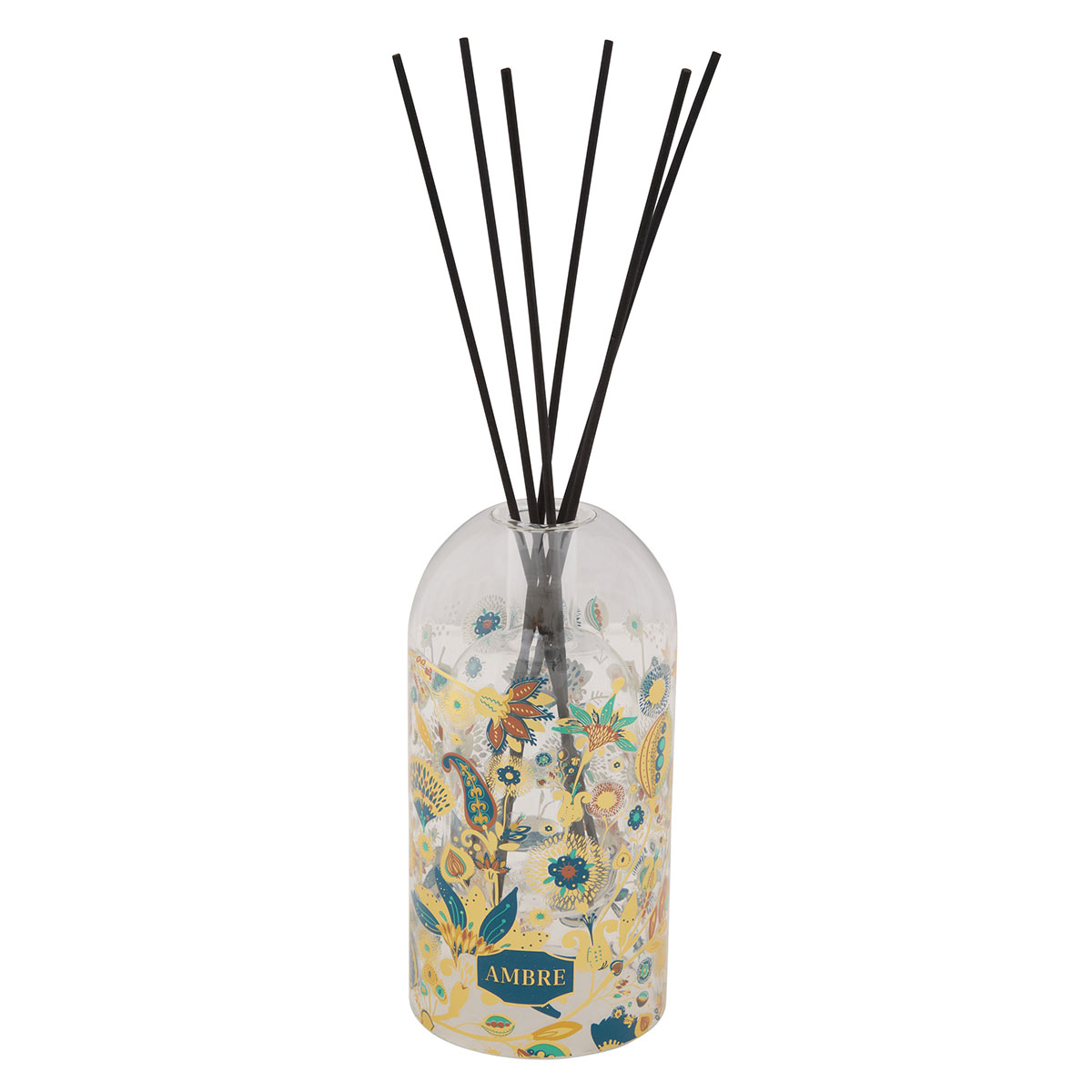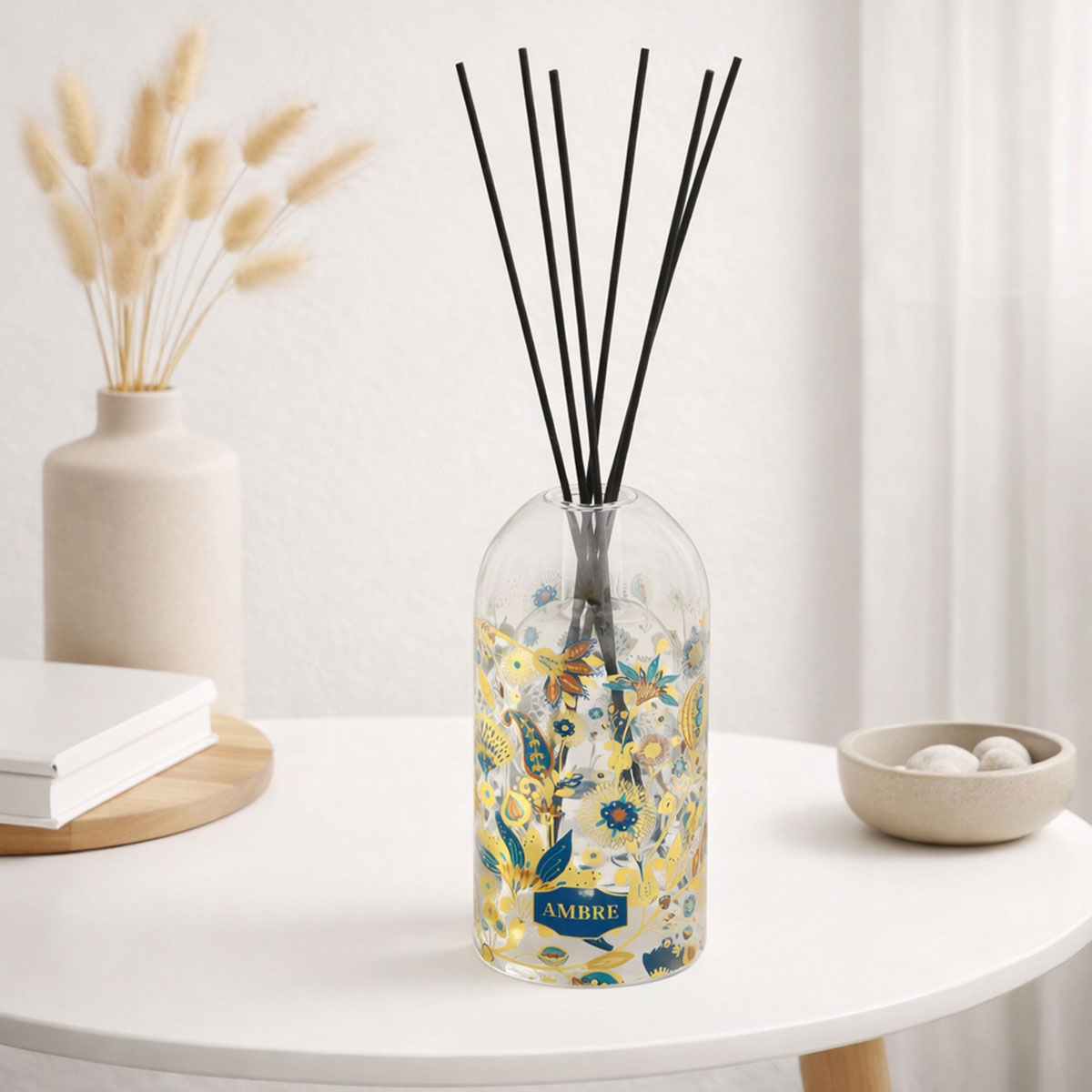 Αρωματικό υγρό χώρου που θα χαρίσει μυρωδιά από κεχριμπάρι και ξύλο στο χώρο σας. Το μπουκάλι είναι από διάφανο γυαλί με πετρόλ και κίτρινα σχέδια και έχει χωρητικότητα 150ml. Οι αισθησιακές και ξυλώδεις νότες του, δημιουργούν αίσθηση άνεσης και πολυτέλειας, ιδανικές για σαλόνι, υπνοδωμάτιο ή γραφείο. Τα στικς εξασφαλίζουν σταθερή και διακριτική διάχυση του αρώματος, ενώ παράλληλα αποτελούν κομψό διακοσμητικό στοιχείο. Το υγρό και τα στικς διαχέουν άρωμα περίπου για 12 εβδομάδες.