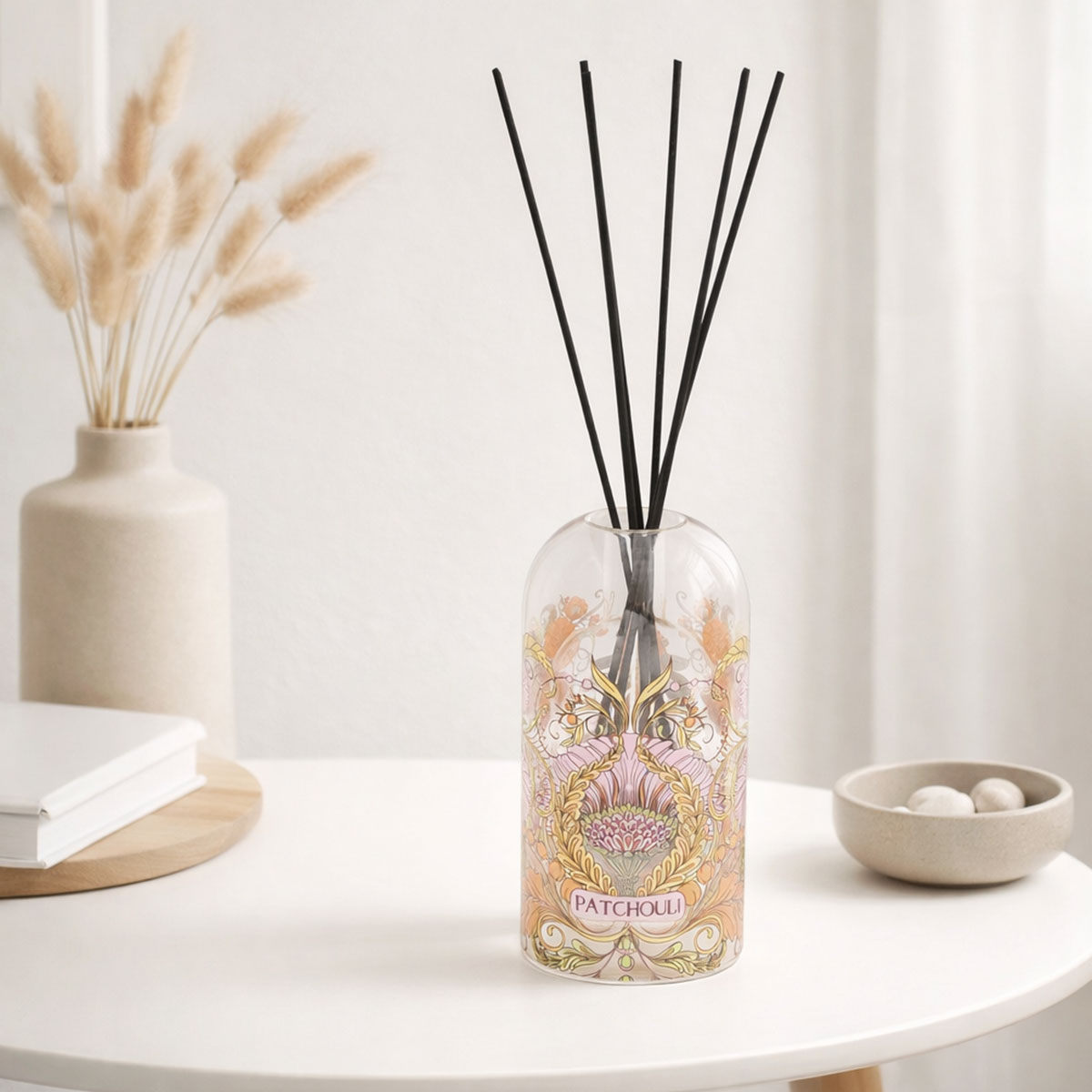 Αρωματικό υγρό χώρου που θα χαρίσει άρωμα από πατσουλί στο χώρο σας. Το μπουκάλι είναι από διάφανο γυαλί με ροζ και σομόν σχέδια και έχει χωρητικότητα 150ml. Οι γήινες, βαθιές νότες του πατσουλί θα χαρίσουν αίσθηση χαλάρωσης και ισορροπίας, ιδανικές για σαλόνι, υπνοδωμάτιο ή γραφείο. Τα στικς διαχέουν το άρωμα σταδιακά και διακριτικά, προσφέροντας σταθερή αρωματική εμπειρία και κομψή διακοσμητική παρουσία. Το υγρό και τα στικς διαχέουν άρωμα περίπου για 12 εβδομάδες.