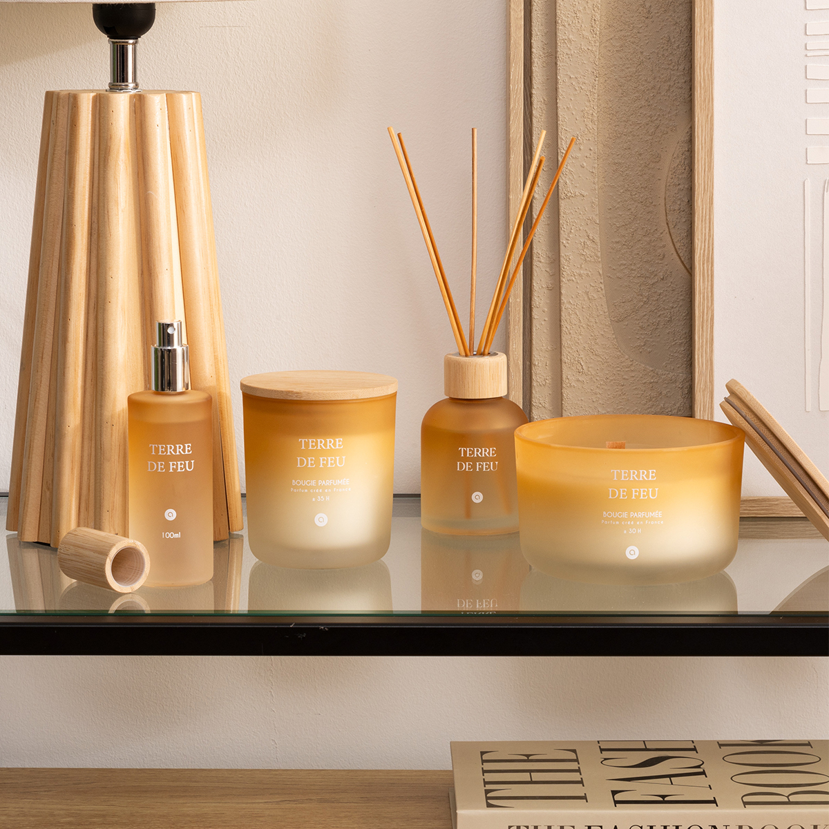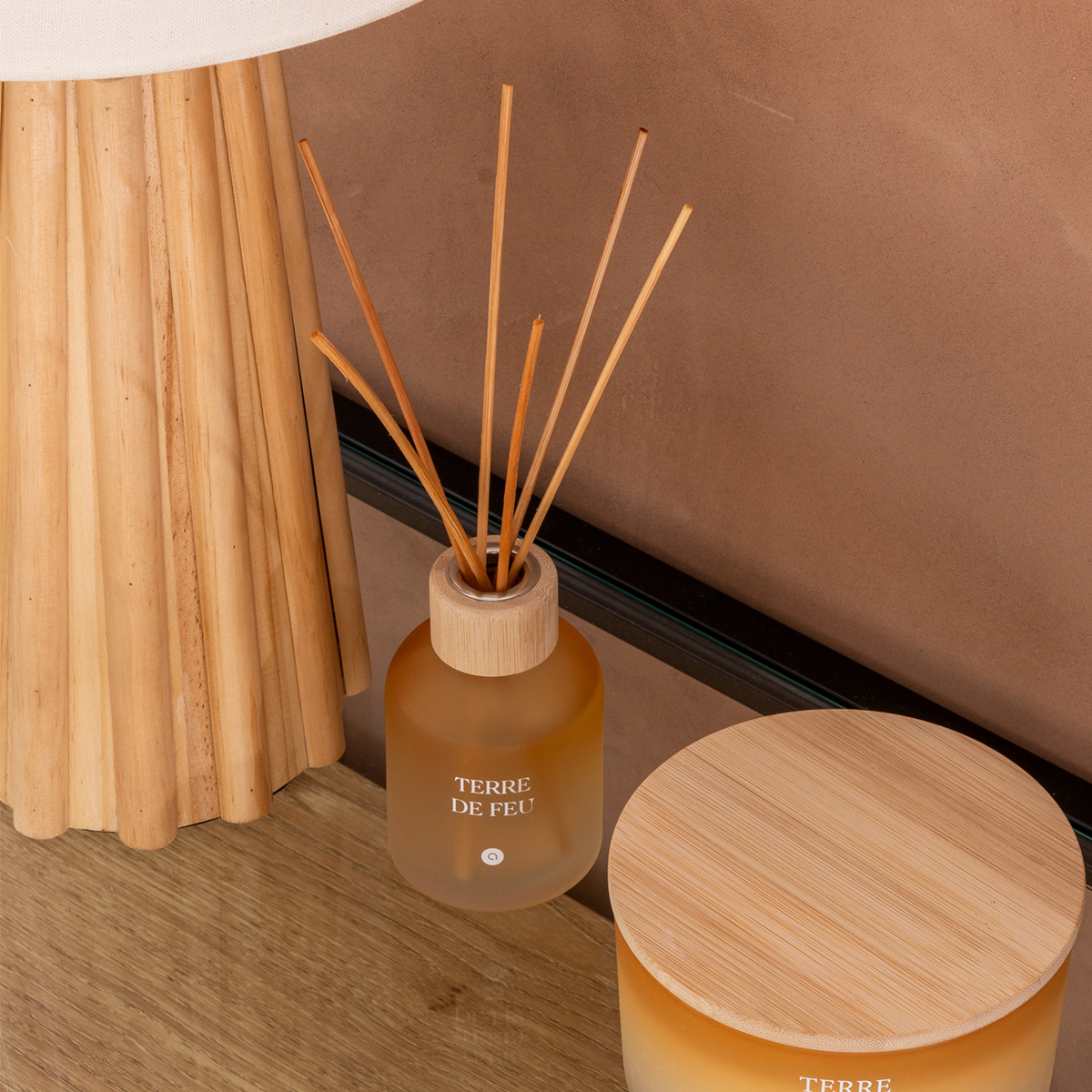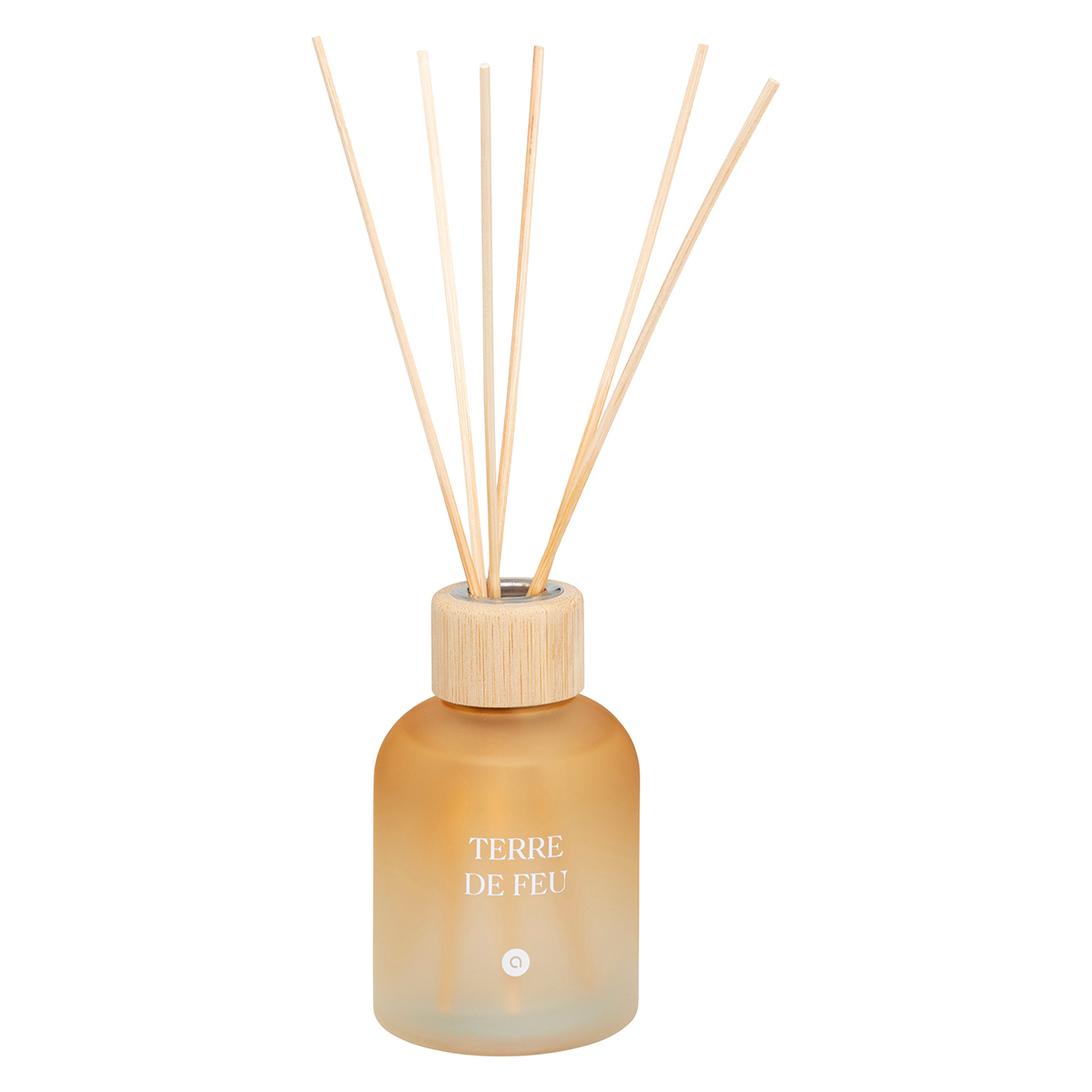 Αρωματικό υγρό χώρου με στικς Terre de Feu με βάρος 150gr. Το άρωμα Terre de Feu αποπνέει μια έντονη αίσθηση ζεστασιάς, πάθους και μυστηρίου. Προσφέρει ισχυρή και αισθησιακή εμπειρία, εμπνευσμένη από την ένταση και τη δύναμη της φωτιάς, ενώ ταυτόχρονα συνδυάζει γήινες και θερμές νότες. Είναι τοποθετημένο σε γυάλινο βαζάκι με σομόν χρώμα. Με τα ξύλινα στικς το άρωμα διαχέεται μοναδικά στο χώρο δίνοντας στην ατμόσφαιρα μία κομψή νότα. Συνδυάστε το με τα υπόλοιπα προϊόντα της ίδιας συλλογής για ένα ολοκληρωμένο αποτέλεσμα στο χώρο σας.