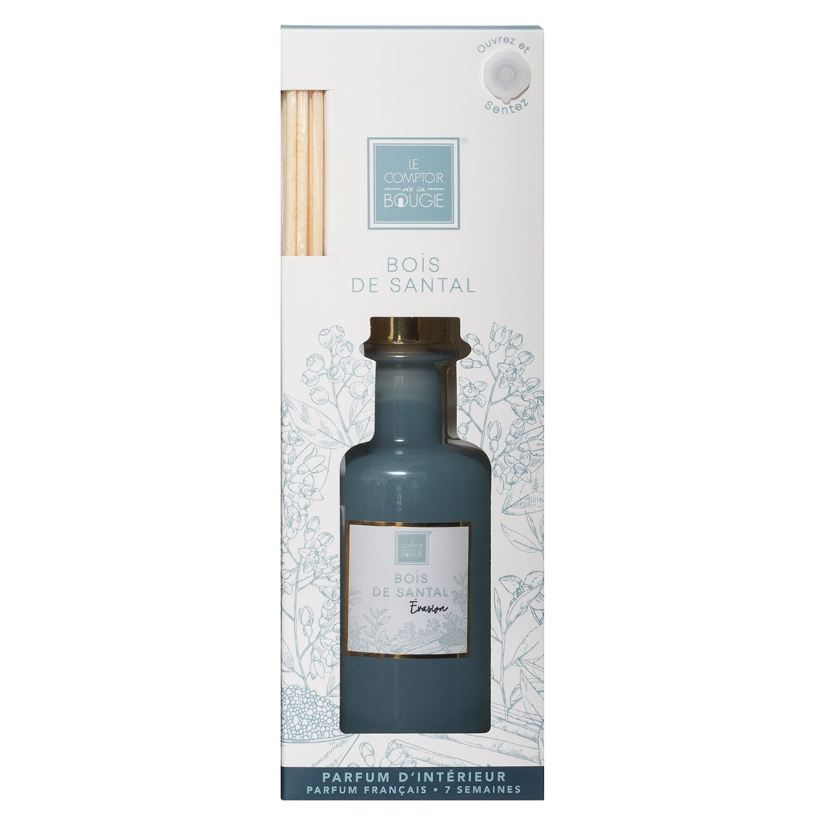 Αρωματικό υγρό χώρου που θα χαρίσει ζεστό άρωμα σανδαλόξυλο στο χώρο σας. Το μπουκάλι είναι γυάλινο σε γαλάζια απόχρωση με χωρητικότητα 200ml. Διαθέτει 8 ξύλινα στικς που διαχέουν το άρωμα μοναδικά στο χώρο. Διάρκεια αρώματος περίπου 24 εβδομάδες.