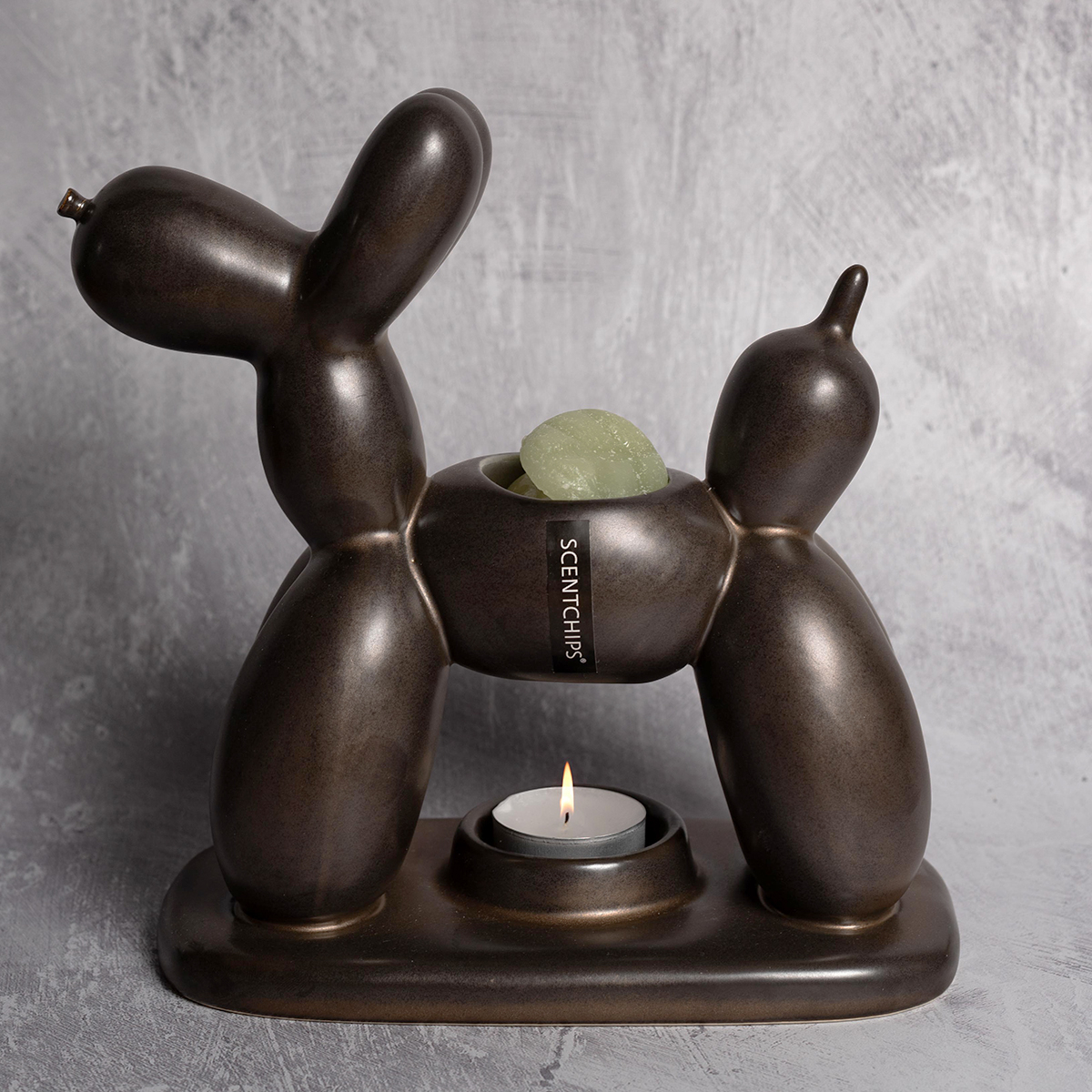 Συσκευή για αιθέρια έλαια σε μπρονζέ χρώμα με μοντέρνο σχεδιασμό σε σχήμα μπαλόνι σκυλάκι, από την εταιρεία Scentchips by Corona di Fiori. Είναι κατασκευασμένη από κεραμικό υλικό και έχει επίστρωση πορσελάνης. Η επίστρωση πορσελάνης έχει την ιδιαιτερότητα να θερμαίνεται σταδιακά με αποτέλεσμα να διαρκεί περισσότερο η μυρωδιά του ελαίου. Ιδανική για αρωματικά έλαια αλλά και wax melts. Τοποθετήστε νερό στο πάνω μέρος του αρωματιστή και μερικές σταγόνες από το έλαιο σας. Σε περίπτωση που χρησιμοποιήσετε wax melts, δεν χρειάζεται να προσθέσετε νερό. Στη συνέχεια τοποθετήστε ένα ρεσώ στο κάτω μέρος.