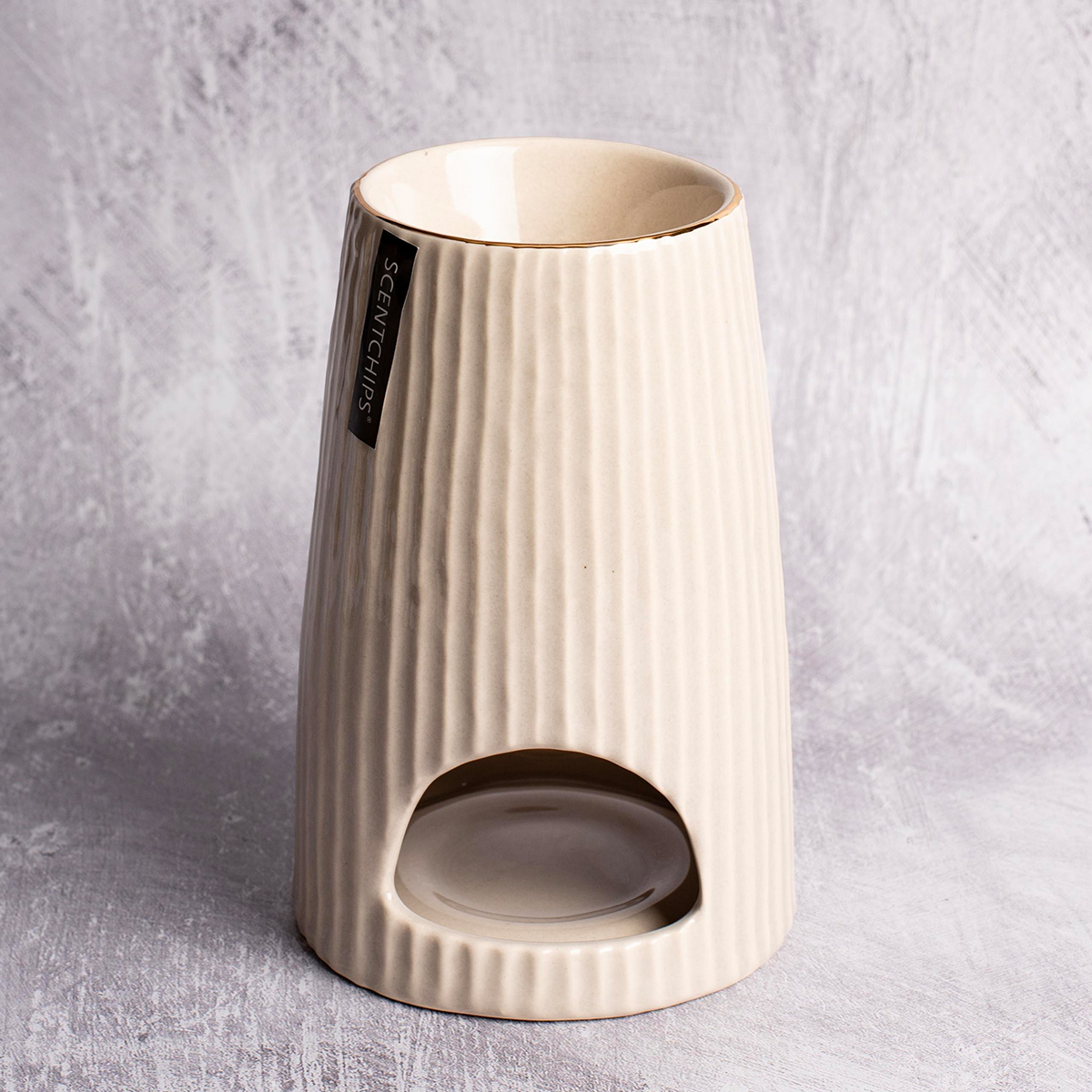 Συσκευή για αιθέρια έλαια σε μπεζ χρώμα με ανάγλυφο σχέδιο, από την εταιρεία Scentchips by Corona di Fiori. Είναι κατασκευασμένη από κεραμικό υλικό και έχει επίστρωση πορσελάνης. Η επίστρωση πορσελάνης έχει την ιδιαιτερότητα να θερμαίνεται σταδιακά με αποτέλεσμα να διαρκεί περισσότερο η μυρωδιά του ελαίου. Ιδανική για αρωματικά έλαια αλλά και wax melts. Τοποθετήστε νερό στο πάνω μέρος του αρωματιστή και μερικές σταγόνες από το έλαιο σας. Σε περίπτωση που χρησιμοποιήσετε wax melts, δεν χρειάζεται να προσθέσετε νερό. Στη συνέχεια τοποθετήστε ένα ρεσώ στο κάτω μέρος.