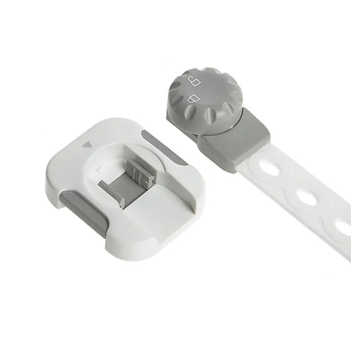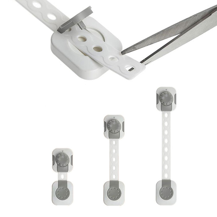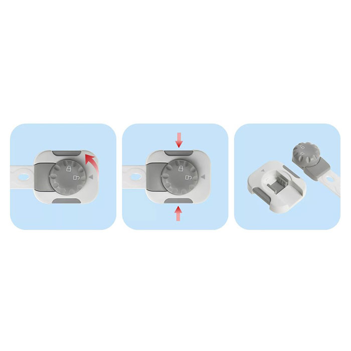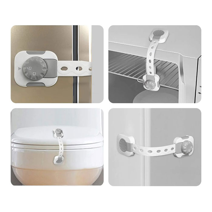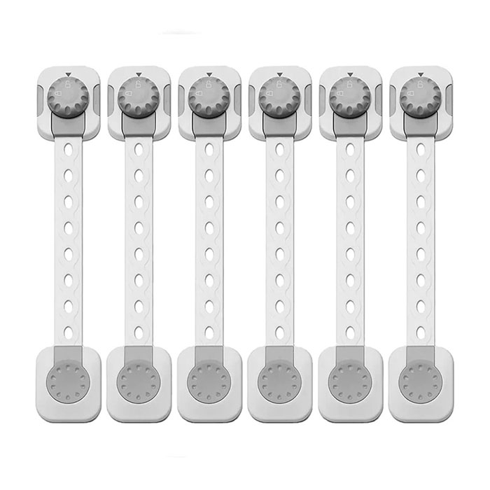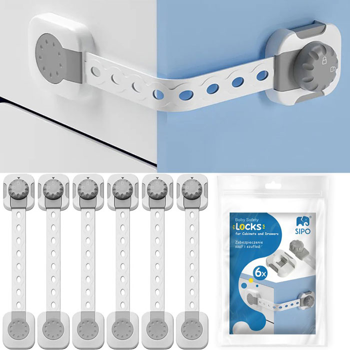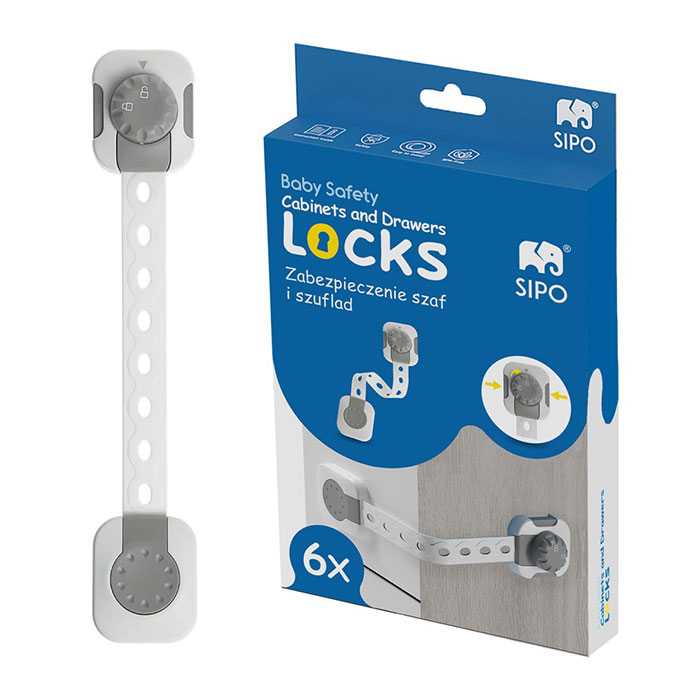 Ασφάλειες πολλαπλών χρήσεων σετ 6 τεμαχίων από την εταιρεία Sipo. Έχουν λευκό χρώμα με γκρι λεπτομέρειες. Είναι κατασκευασμένες από πλαστικό υλικό ABS. Είναι ρυθμιζόμενες δηλαδή μπορείτε να ρυθμίσετε το μήκος σύμφωνα με τις ανάγκες σας. Έχουν λειτουργία smart lock. Για να ξεκλειδώσετε, απλά γυρίστε το κουμπί στο σύμβολο του ανοιχτού λουκέτου. Δεν απαιτούνται πρόσθετα εργαλεία για την τοποθέτησή τους. Επίσης, δεν αφήνουν σημάδια κατά την αφαίρεσή τους. Η κλειδαριά παρέχει γρήγορη πρόσβαση στους ενήλικες και κρατάει μακριά τα μικρά παιδιά. Πριν την τοποθέτηση καθαρίστε και στεγνώστε καλά την επιφάνεια. Ξεκολλήστε την ταινία από την ασφάλεια και κολλήστε την ασφάλεια στο σημείο που θέλετε. Πιέστε σταθερά για να κολλήσει. Η κόλλα σταθεροποιείται σε περίπου 24 ώρες.