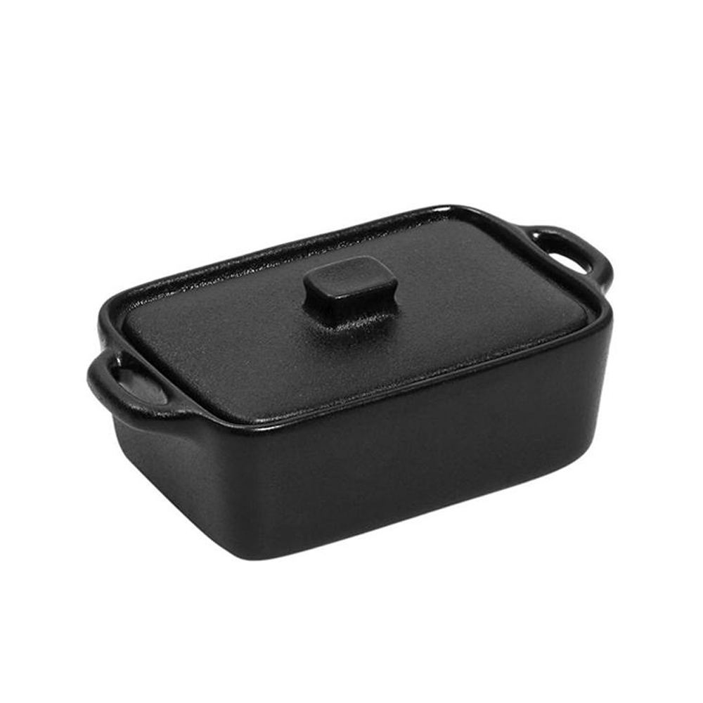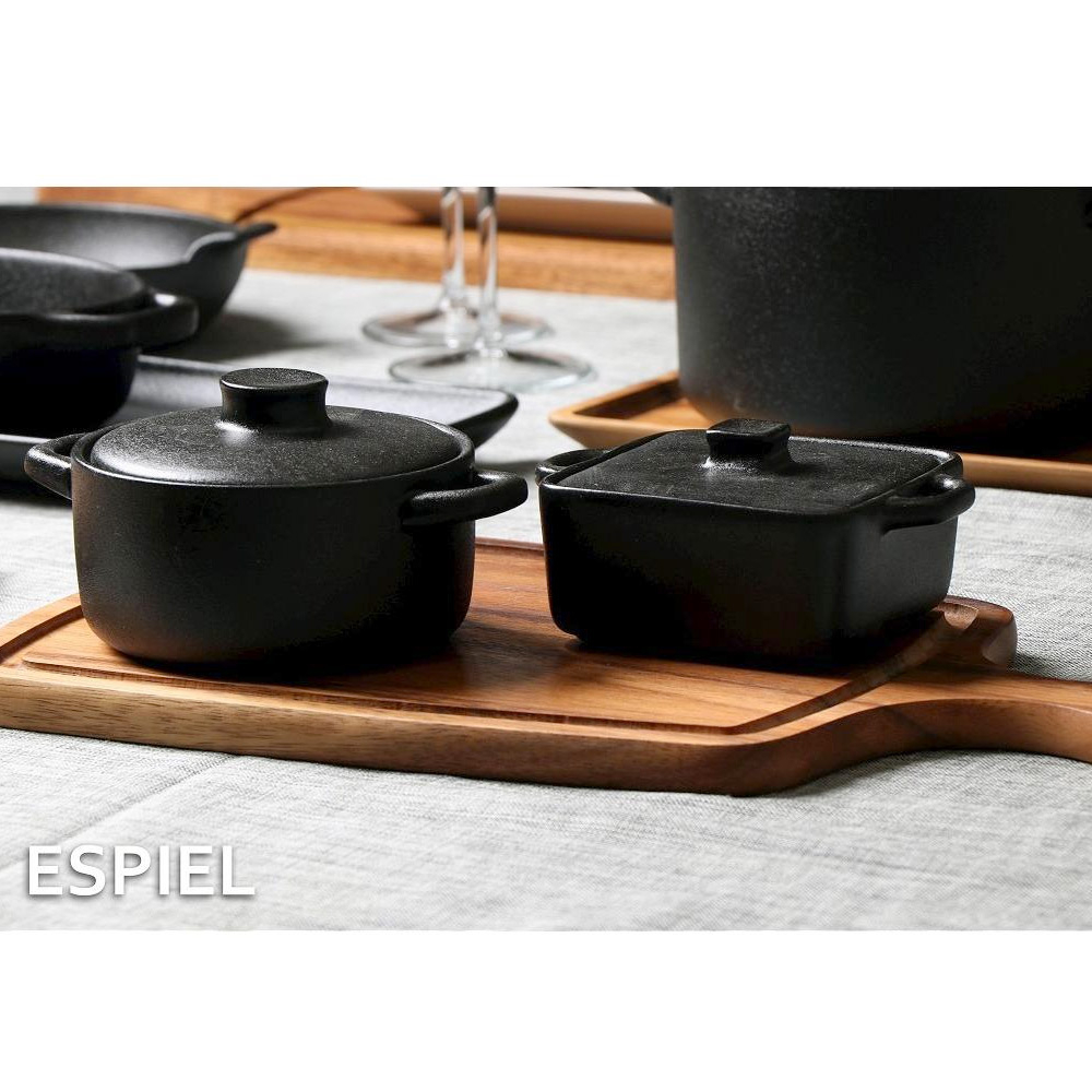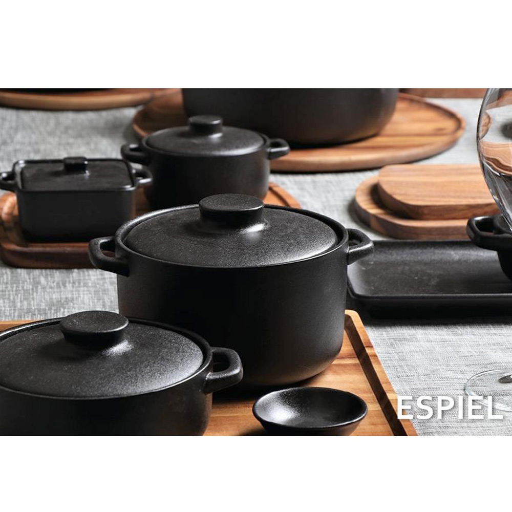 Ρηχό πυρίμαχο σκεύος γιουβετσάκι σε ορθογώνιο σχήμα με καπάκι από την εταιρεία Espiel. Είναι κατασκευασμένο από κεραμικό υλικό σε μαύρο χρώμα. Διαθέτει λαβές για εύκολη μεταφορά. Με όψη μαντεμιού που αποπνέει "παράδοση", αλλά κι ο τρόπος κατασκευής της από υψηλής ποιότητας stoneware προσθέτει αντοχή στο προϊόν και εξασφαλίζει ένα υγιεινό μαγείρεμα. Μπορεί να χρησιμοποιηθεί και ως σκεύος σερβιρίσματος. Συνδυάστε το με τα υπόλοιπα σκεύη της ίδιας συλλογής για ένα ολοκληρωμένο αποτέλεσμα στην κουζίνα σας.