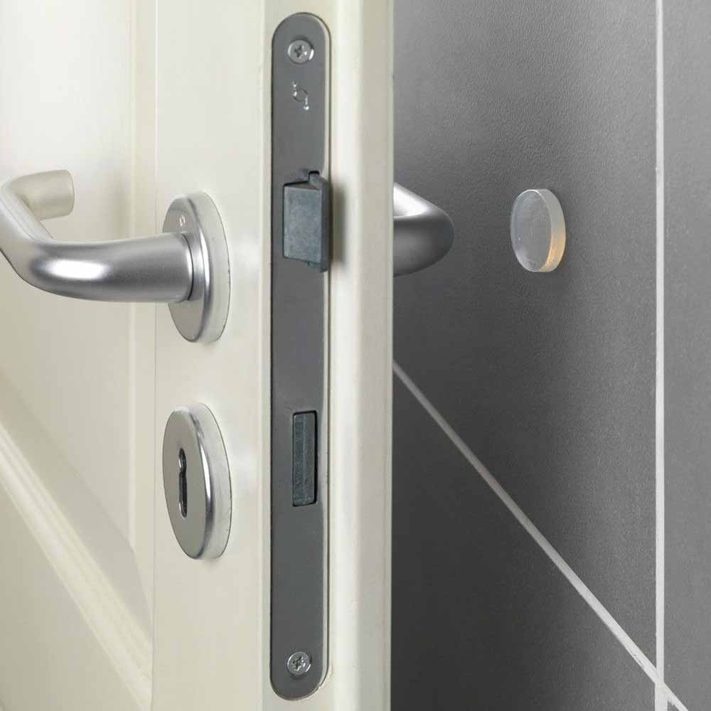 Σετ διάφανα προστατευτικά λαστιχάκια της γερμανικής εταιρείας Wenko. Τοποθετούνται πολύ εύκολα απλώς αφαιρώντας την προστατευτική μεμβράνη από την αυτοκόλλητη όψη τους. Είναι πολύ πρακτικά καθώς προστατεύουν τον τοίχο, το σοβά, την ταπετσαρία, τα πλακάκια από τις κρούσεις. Έτσι λοιπόν αποφεύγονται οι γρατζουνιές και οι φθορές όχι μόνο στις παραπάνω επιφάνειες αλλά και στα χερούλια. Πολύ σημαντικό χαρακτηριστικό τους είναι η μείωση του θορύβου, καθώς πλέον οι πόρτες δεν σταματάνε με δύναμη στον τοίχο, αλλά στο λαστιχάκι.