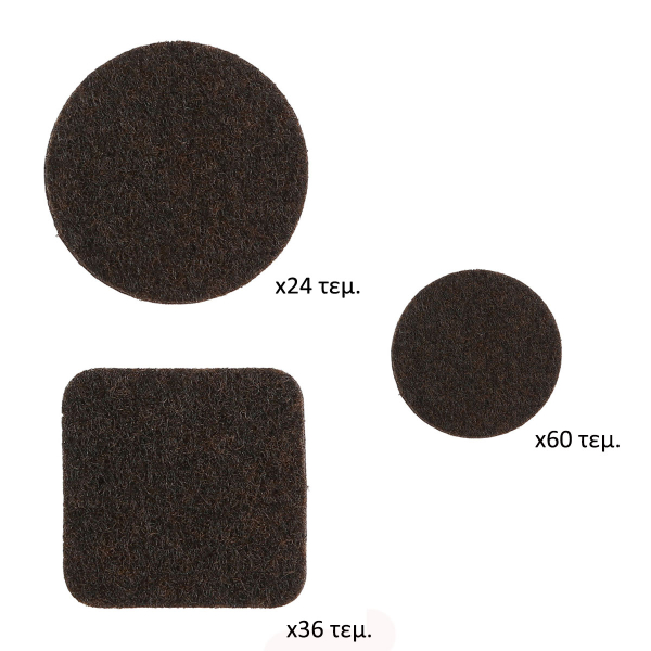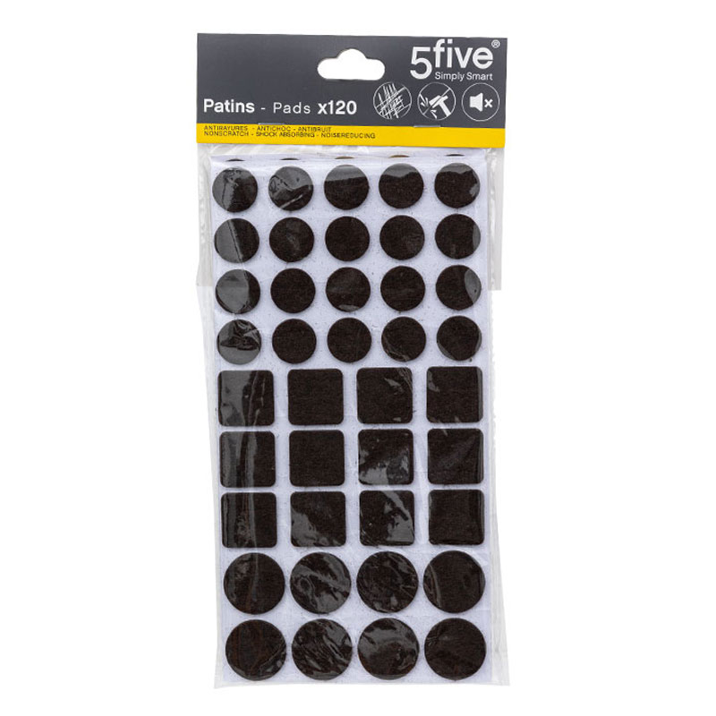 Αυτοκόλλητα τσοχάκια επίπλων σε μαύρο χρώμα. Τοποθετούνται στο κάτω μέρος του επίπλου και σας επιτρέπουν να το μετακινείτε εύκολα και χωρίς θόρυβο σε λείες επιφάνειες χωρίς φθορές στο δάπεδο. Προσφέρουν ασφάλεια σε λάμινεϊτ δάπεδα, κεραμικά πλακάκια και άλλες ευαίσθητες επιφάνειες. Κατάλληλα για ξύλινα πόδια επίπλων. Η ανθεκτική στην τριβή τσόχα σε συνδυασμό με την ισχυρή κόλλα, προσφέρουν μεγάλη διάρκεια ζωής. Τρόπος εφαρμογής: Η επιφάνεια πρέπει να είναι καθαρή, στεγνή και χωρίς λάδια. Κολλάτε τα αυτοκόλλητα στο επιθυμητό σημείο και πιέζετε σταθερά. Μην χρησιμοποιήσετε το έπιπλο για 24 ώρες ώστε να ενωθεί η κόλλα με το υλικό. Η συσκευασία περιλαμβάνει 120 αυτοκόλλητα σε διάφορα μεγέθη.