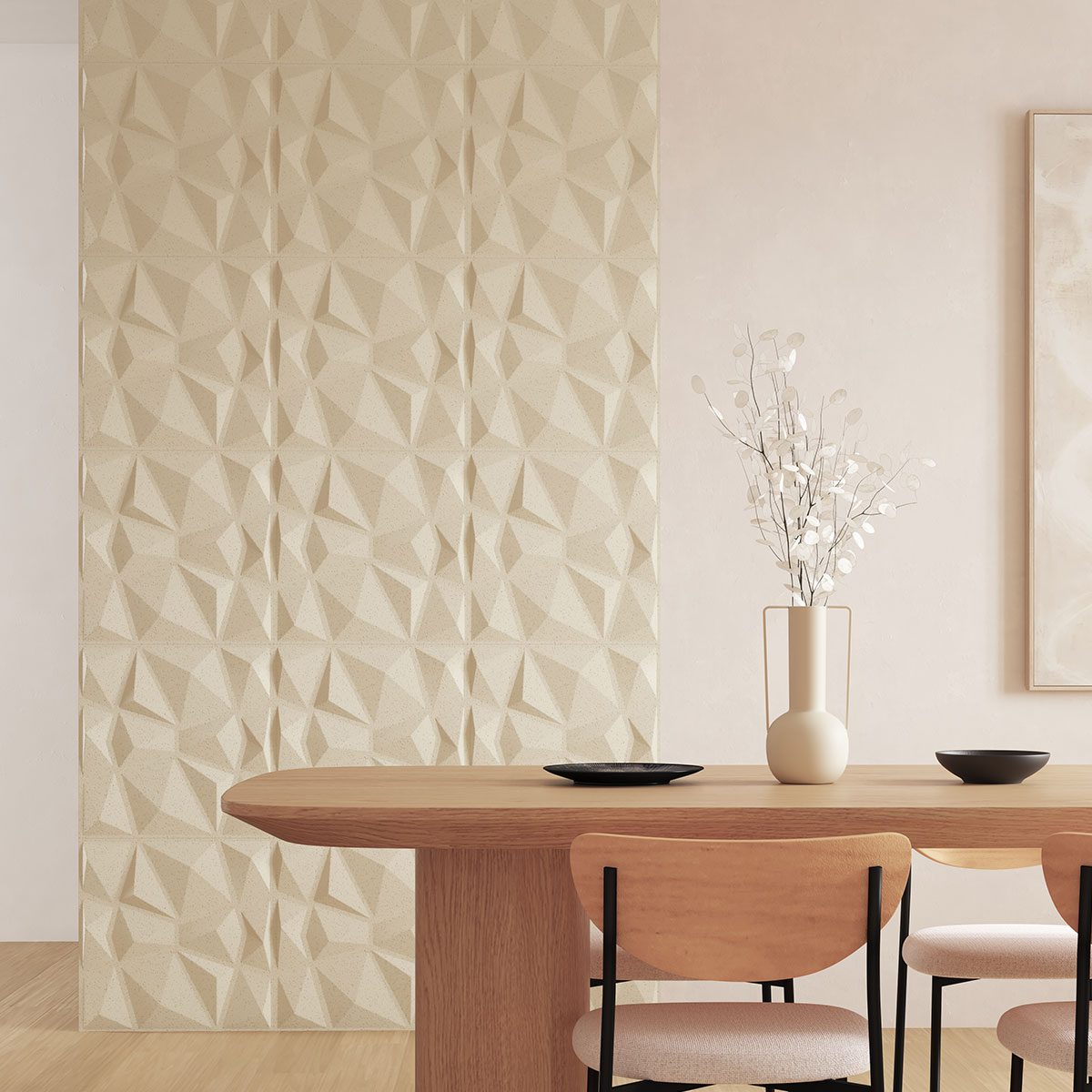 Τρισδιάστατα διακοσμητικά αυτοκόλλητα πάνελ τοίχου σε σετ 2 τεμαχίων. Είναι κατασκευασμένα από πλαστικό υλικό (PVC) σε εκρού χρώμα με ανάγλυφο σχέδιο. Μπορείτε να προσθέσετε περισσότερα κομμάτια και να φτιάξετε μια σύνθεση ή να τα βάλετε πίσω από το κρεβάτι σαν κεφαλάρι. Ιδανικό για οικιακούς και επαγγελματικούς εσωτερικούς χώρους. Μην τοποθετείται σε φρεσκοβαμμένους τοίχους ή ανώμαλες επιφάνειες.