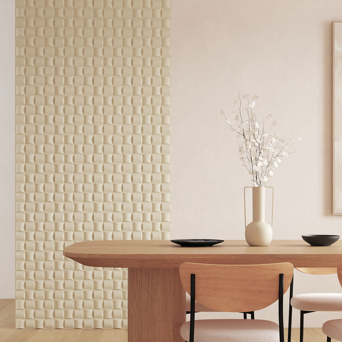 Τρισδιάστατα διακοσμητικά αυτοκόλλητα πάνελ τοίχου σε σετ 2 τεμαχίων. Είναι κατασκευασμένα από πλαστικό υλικό (PVC) σε εκρού χρώμα με ανάγλυφο σχέδιο. Μπορείτε να προσθέσετε περισσότερα κομμάτια και να φτιάξετε μια σύνθεση ή να τα βάλετε πίσω από το κρεβάτι σαν κεφαλάρι. Ιδανικό για οικιακούς και επαγγελματικούς εσωτερικούς χώρους. Μην τοποθετείται σε φρεσκοβαμμένους τοίχους ή ανώμαλες επιφάνειες.