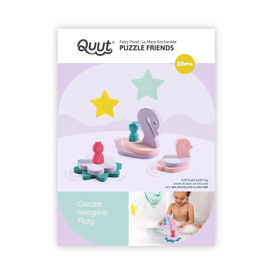 Τρισδιάστατο παζλ για το μπάνιο της εταιρίας Quut. Πολύχρωμα κομμάτια που απεικονίζουν κύκνους, λουλούδια, αστεράκια και δακτυλοκουκλάκια νεραϊδούλες. Κατασκευασμένα από αφρώδες ανακυκλώσιμο υλικό, απαλλαγμένο από BPA, φθαλικά και latex. Κολλάνε στις επιφάνειες του μπάνιου (πλακάκια, μπανιέρα) όταν βρέχονται και λειτουργούν σαν μαγνήτης. Όταν είναι στεγνά δεν κολλάνε. Τα κομμάτια δεν απορροφούν νερό, αλλά επιπλέουν σε αυτό. Τα παιδιά διασκεδάζουν παίζοντας κατά τη διάρκεια του μπάνιου! Παράλληλα βελτιώνουν τις κινητικές τους δεξιότητες, συνδυάζοντας διαφορετικά σχήματα και χρώματα και δημιουργώντας υπέροχες ιστορίες. Όλα τα προϊόντα της Quutopia τηρούν τις προδιαγραφές ασφαλείας. Ξεπλύνετε καλά μετά από κάθε χρήση και τοποθετήστε τα κομμάτια σε σημείο όπου μπορούν να στεγνώσουν εντελώς. Για να καθαρίσετε τα κομμάτια, μπορείτε να χρησιμοποιήσετε ένα ήπιο απορρυπαντικό.