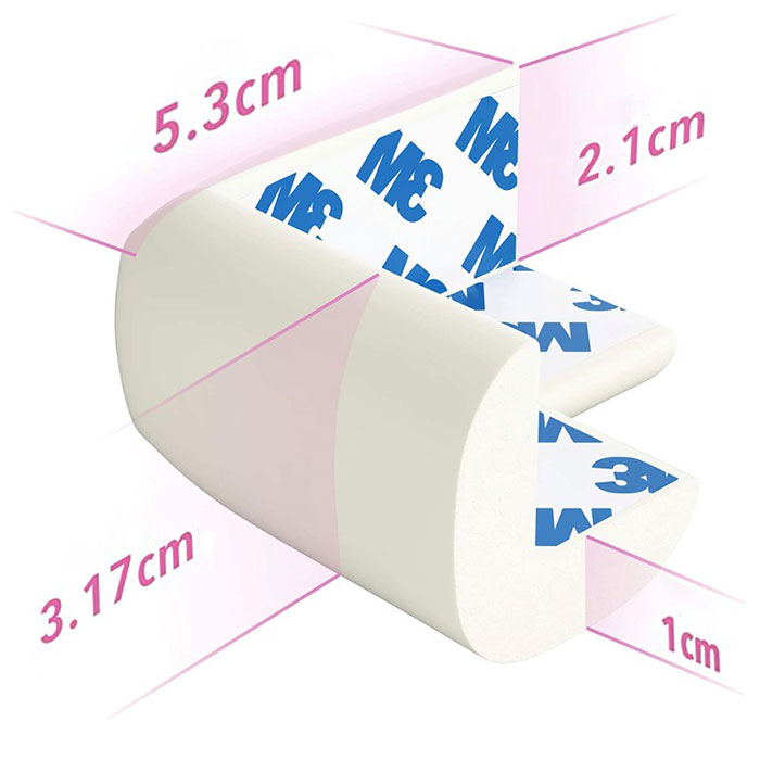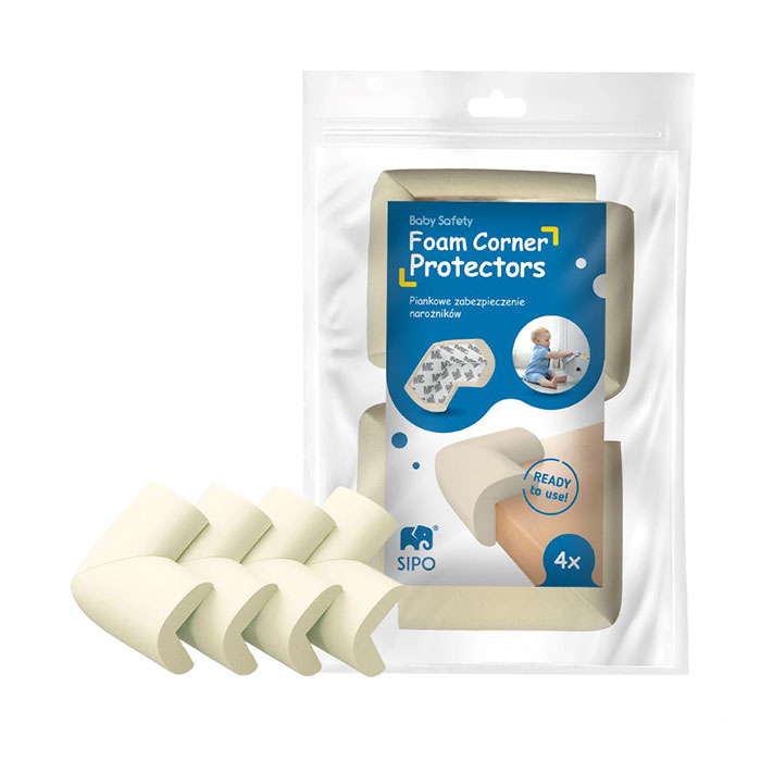 Προστατευτικά για γωνίες από την εταιρεία Sipo σε λευκό χρώμα. Είναι κατασκευασμένα από αφρό NBR. Ο αφρός απορροφά τη δύναμη κρούσης, μειώνοντας τον κίνδυνο τραυματισμού. Είναι ιδιαίτερα μαλακά και εύκαμπτα ώστε να μπορείτε να τα τοποθετείτε στις γωνίες των επίπλων. Επίσης, είναι χρήσιμα για τα παιδιά που μόλις μαθαίνουν να περπατούν και έτσι εκτίθενται σε συχνή επαφή με έπιπλα. Διαθέτουν ταινία, καθιστώντας τα εύκολο να τοποθετηθούν στις γωνίες των επίπλων όπως τραπέζια, καρέκλες, γραφεία, ντουλάπια κλπ. Πριν την τοποθέτηση καθαρίστε και στεγνώστε καλά την επιφάνεια. Ξεκολλήστε την ταινία από την ασφάλεια και κολλήστε την ασφάλεια στο σημείο που θέλετε. Πιέστε σταθερά για να κολλήσει. Η κόλλα σταθεροποιείται σε περίπου 24 ώρες. Τα παιδιά μπορεί να αφαιρούν κομμάτια της ταινίας γι' αυτό συνιστάται ο τακτικός έλεγχος. Καθαρίζεται εύκολα με ένα νωπό πανί.