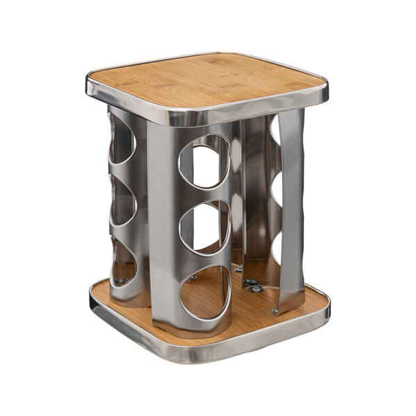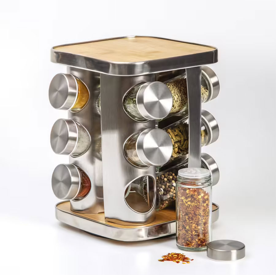Σετ από 12 γυάλινα βαζάκια μπαχαρικών με σταντ. Τα βαζάκια έχουν ανοξείδωτα καπάκια και κλείνουν αεροστεγώς για να παραμένουν τα μπαχαρικά φρέσκα, χωρίς να χάνουν το άρωμά τους. Το σταντ είναι περιστρεφόμενο, κατασκευασμένο από ανοξείδωτο ατσάλι με μπεζ λεπτομέρειες από bamboo ξύλο. Σας επιτρέπει να μαγειρεύετε άνετα, διατηρώντας την κουζίνα τακτοποιημένη.