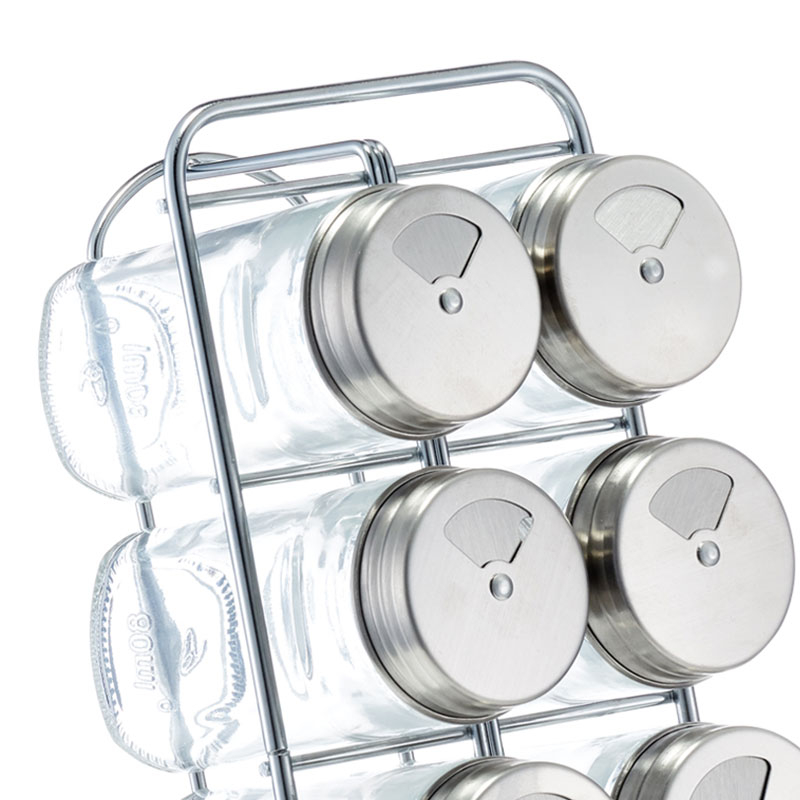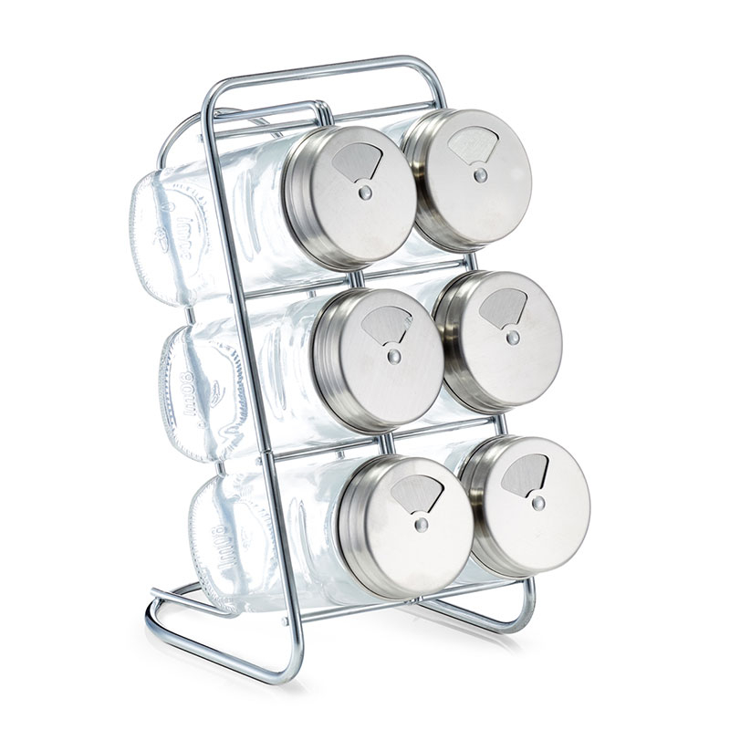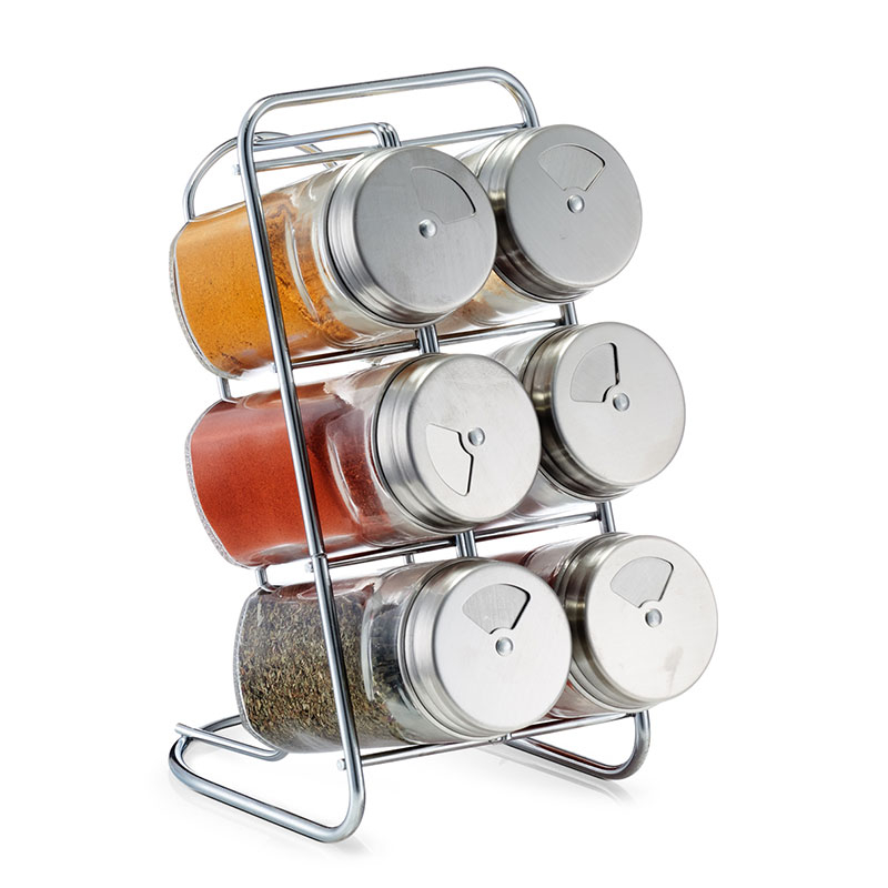Σετ από 6 βαζάκια μπαχαρικών σε σταντ. Τα βαζάκια είναι κατασκευασμένα από διάφανο γυαλί με ασημί ανοξείδωτο καπάκι που έχει ρυθμιζόμενη ροή και κλείνουν αεροστεγώς για να παραμένουν τα μπαχαρικά φρέσκα, χωρίς να χάνουν το άρωμά τους. Το σταντ είναι κατασκευασμένο από μεταλλικό υλικό σε ασημί χρώμα. Σας επιτρέπει να μαγειρεύετε άνετα, διατηρώντας την κουζίνα τακτοποιημένη. Τα βαζάκια μπορούν να πλυθούν στο πλυντήριο πιάτων χωρίς τα καπάκια. *Τα μπαχαρικά στις φωτογραφίες δεν περιλαμβάνονται.*