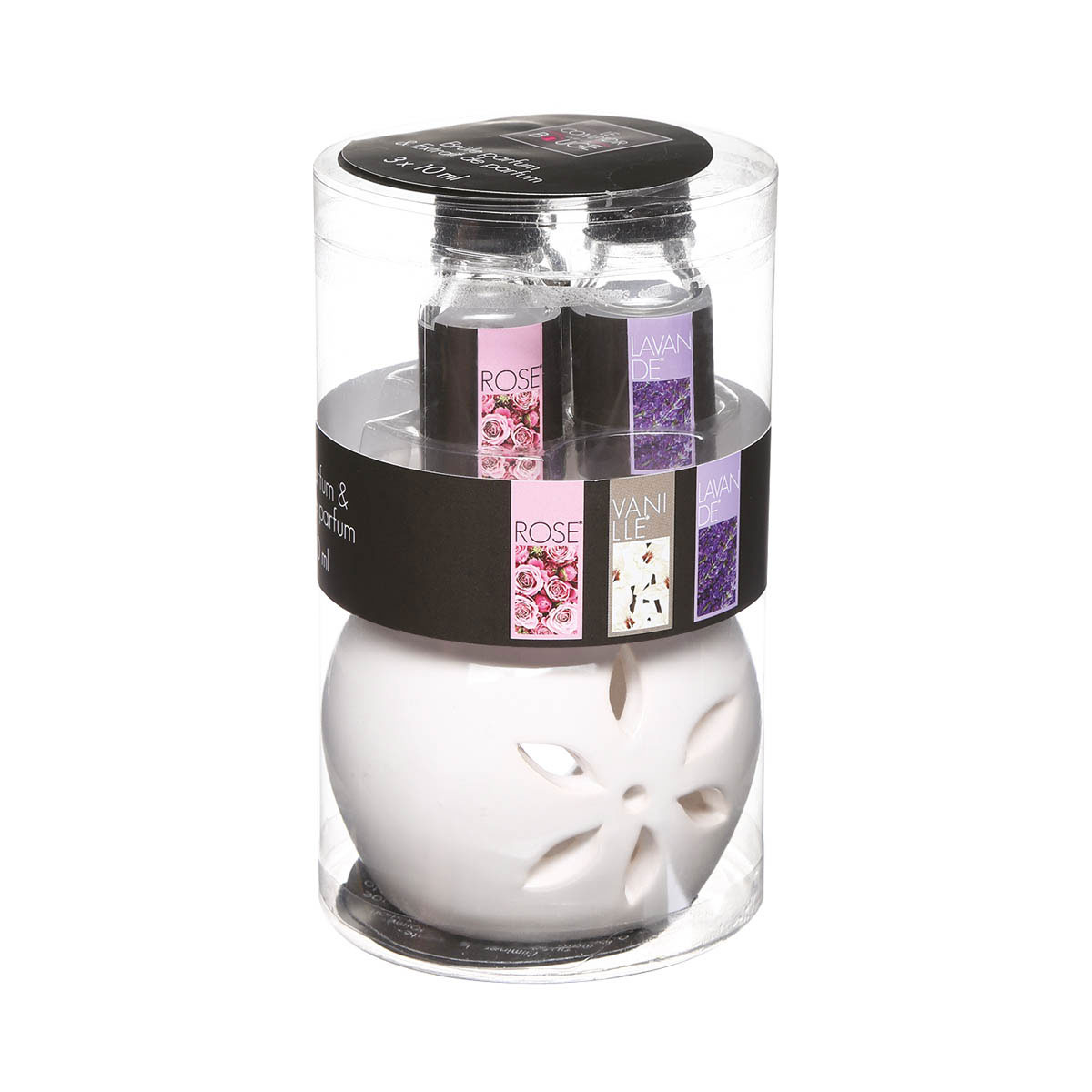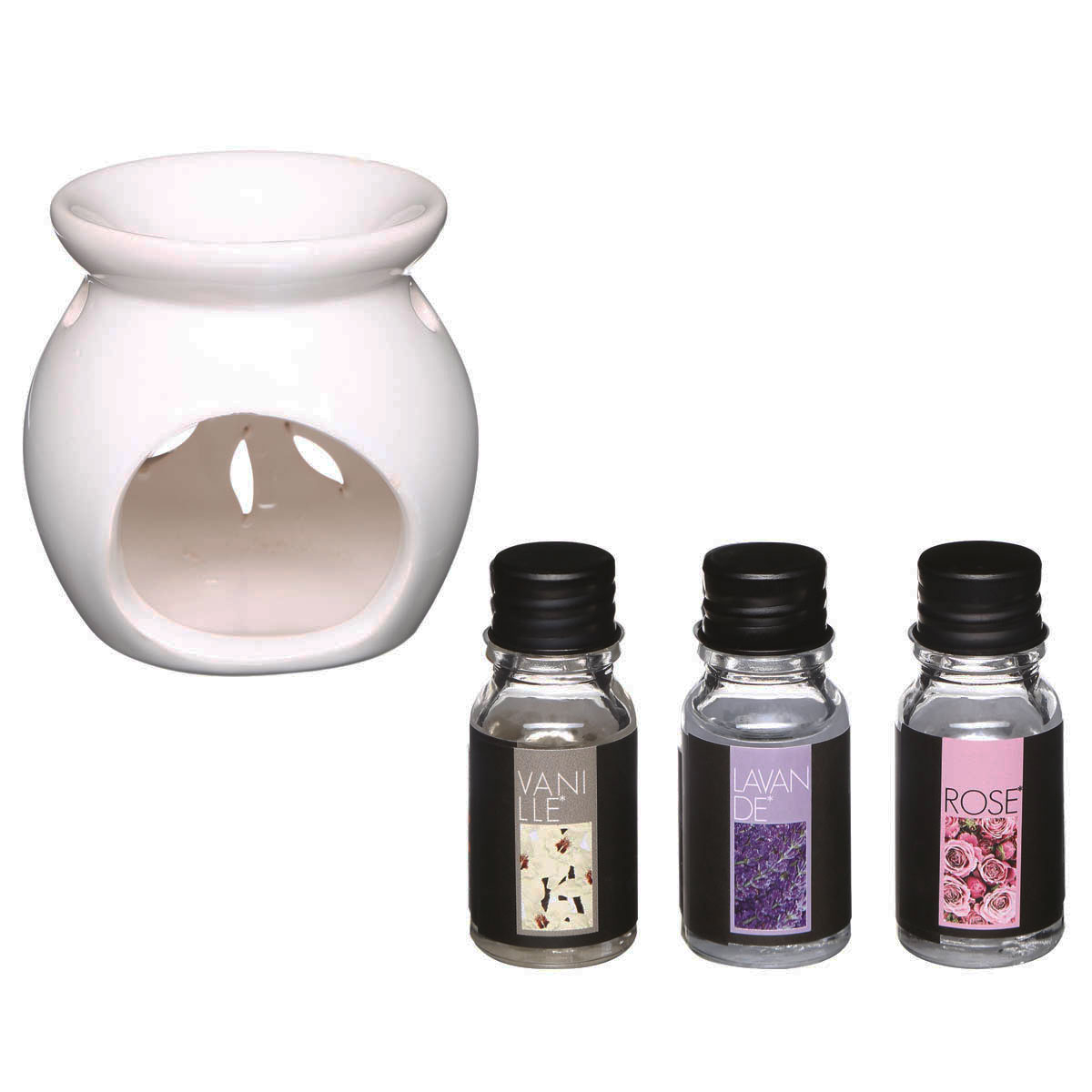 Σετ αρωματοθεραπείας που θα χαρίσει μοναδικά αρώματα στο χώρο σας. Το σετ αποτελείται από 1 κεραμική βάση καύσης αρωματικού και 3 λάδια με άρωμα βανίλια, λεβάντα και τριαντάφυλλο. Στη βάση αρωματικού τοποθετήστε αναμμένο κερί ρεσώ στο κάτω μέρος και νερό με σταγόνες ελαιου στο επάνω μέρος, ώστε να ζεσταθεί και να απλωθεί διακριτικά το άρωμα στο χώρο.