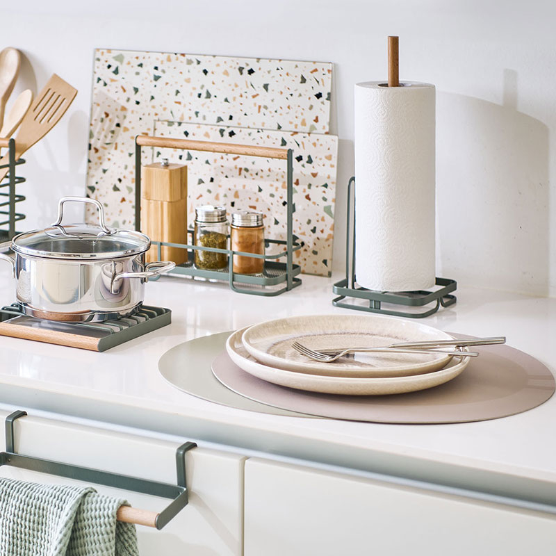 Βάση για ρολό χαρτί κουζίνας κατασκευασμένη από μεταλλικό υλικό σε χακί χρώμα με μπεζ λεπτομέρειες από ξύλο οξιάς. Είναι κατάλληλη για όλα τα τυποποιημένα ρολά κουζίνας. Συνδυάστε τη με τα υπόλοιπα είδη της ίδιας συλλογής για ένα ολοκληρωμένο αποτέλεσμα στο χώρο σας.