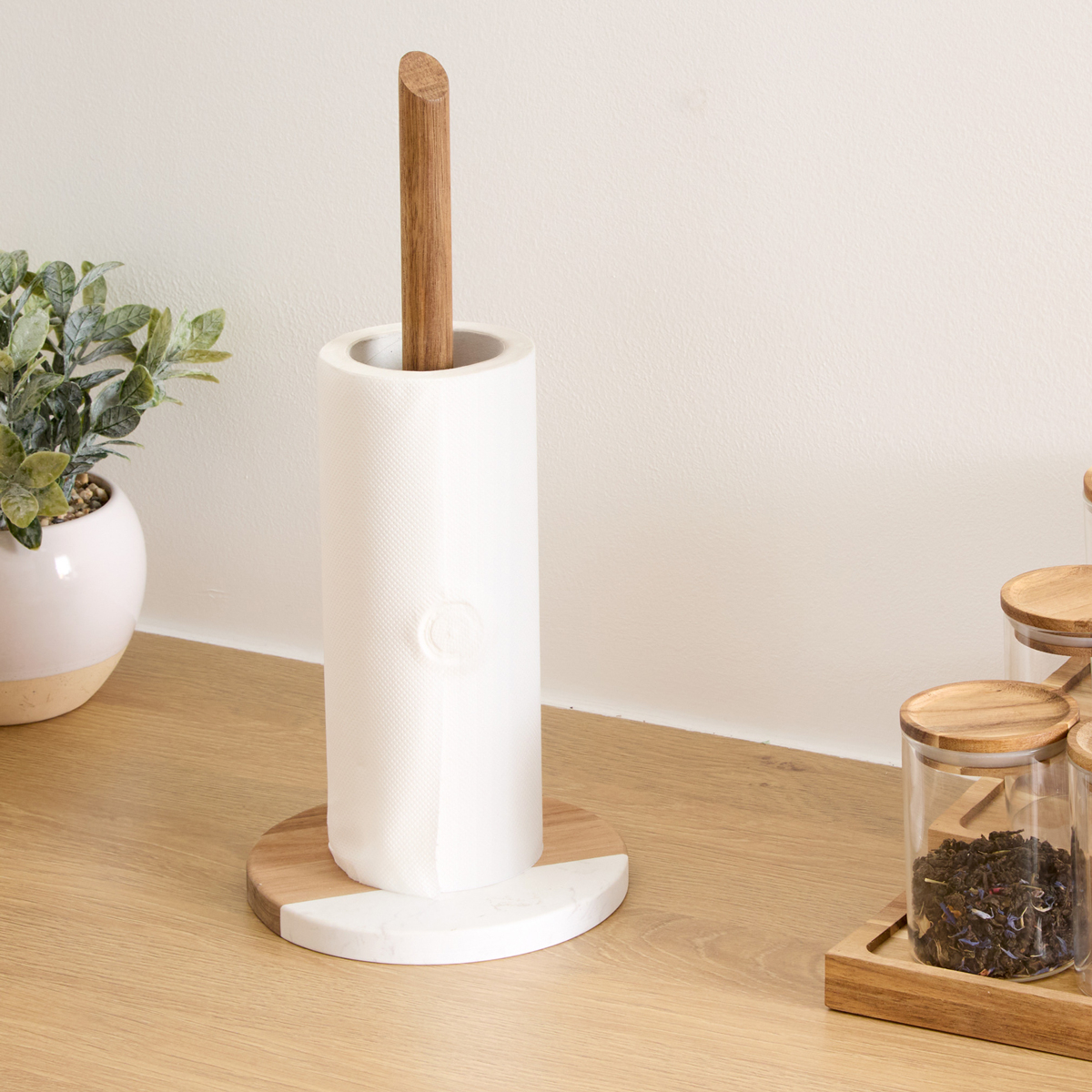 Βάση για ρολό χαρτί κουζίνας, κατασκευασμένη από ξύλο ακακίας με μαρμάρινη λεπτομέρεια. Κατάλληλη για όλα τα τυποποιημένα ρολά κουζίνας. Συνδυάστε τη με τα υπόλοιπα είδη της ίδιας συλλογής για μία αρμονική διακόσμηση.