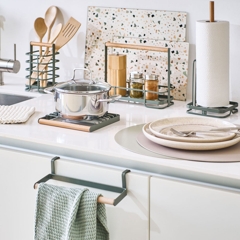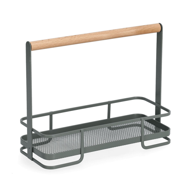 Βάση οργάνωσης που μπορεί να τοποθετηθεί στον πάγκο της κουζίνας και να αξιοποιήσει τον αχρησιμοποίητο χώρο προσφέροντας οργάνωση χώρου. Eίναι κατασκευασμένη από μεταλλικό υλικό σε χακί χρώμα με λαβή από μπεζ ξύλο οξιάς. Προσφέρει αρκετό χώρο για δοχεία μπαχαρικών ή μπορείτε να τοποθετήσετε μπουκάλια (λάδι, ξύδι, κλπ.), κουτιά και άλλα βάζα κουζίνας. Ιδανική βάση οργάνωσης που θα γίνει χρήσιμος βοηθός σε κάθε κουζίνα. Συνδυάστε το με τα υπόλοιπα είδη της ίδιας συλλογής για ένα ολοκληρωμένο αποτέλεσμα στο χώρο σας.