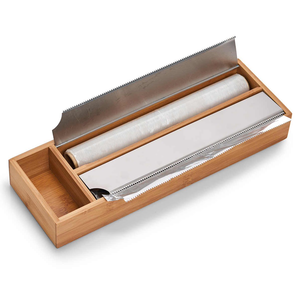 Βάση για αλουμινόχαρτα ή μεμβράνες, κατασκευασμένο από ξύλο bamboo σε φυσική απόχρωση. Το bamboo είναι ένα ιδιαίτερα ελαφρύ, ανθεκτικό υλικό με αντιβακτηριδιακή δράση και φιλικό προς το περιβάλλον. Έχει 2 θέσεις με λεπίδες για να κόβετε εύκολα τα ρολά σας και στο μπροστινό μέρος έχει 1 θηκάκι για να βάζετε λαστιχάκια ή ό,τι άλλο θέλετε. Θα προσθέσει στυλ στην κουζίνα σας και θα διευκολύνει την καθημερινότητα σας.
