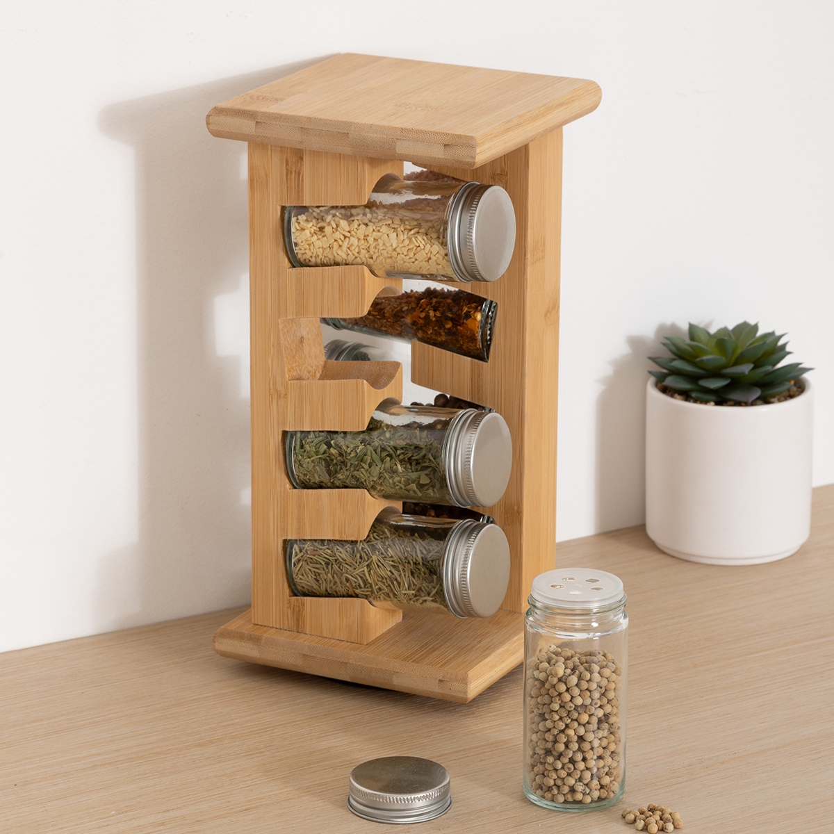 Γυάλινα βαζάκια μπαχαρικών σετ 8 τεμαχίων σε βάση. Έχουν καπάκι από ξύλο bamboo σε φυσική απόχρωση και κλείνουν αεροστεγώς για να παραμένουν τα μπαχαρικά φρέσκα, χωρίς να χάνουν το άρωμά τους. Σας επιτρέπουν να μαγειρεύετε άνετα, διατηρώντας την κουζίνα τακτοποιημένη καθώς σας προσφέρει πρόσβαση στο μπαχαρικό που επιθυμείτε, χωρίς να ψάχνετε τα ντουλάπια σας. Χωρητικότητα: 90ml. *Δεν περιλαμβάνονται μπαχαρικά.*