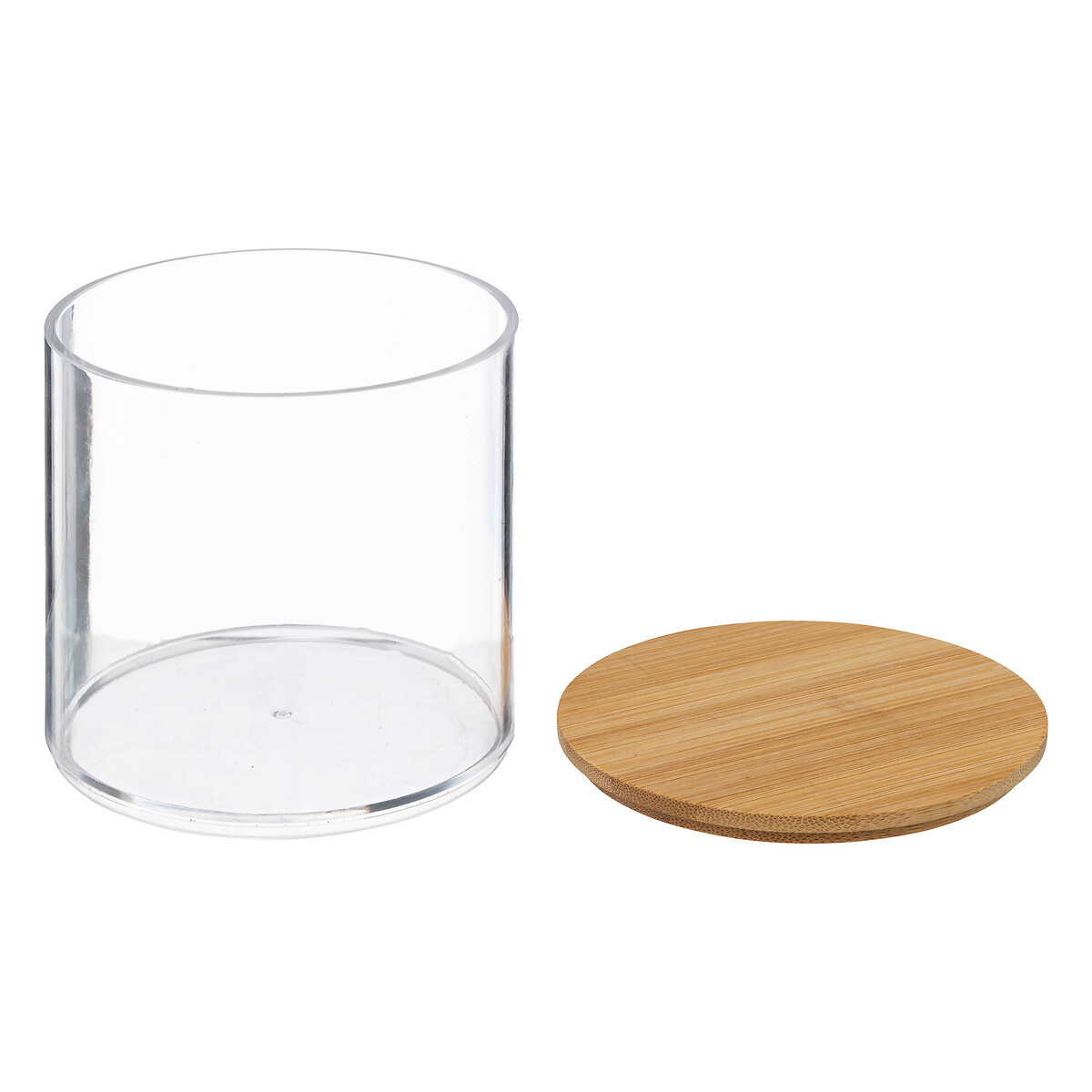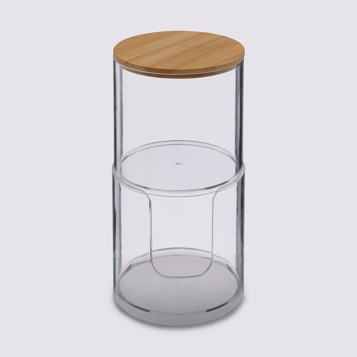 Δοχείο για μπατονέτες και δοχείο με καπάκι για βαμβάκι. Τα δοχεία είναι κατασκευασμένα από πλαστικό υλικό και το καπάκι από bamboo σε μπεζ χρώμα. Συνδυάστε το με τα υπόλοιπα αξεσουάρ της ίδιας σειράς για να οργανώσετε το μπάνιο σας.