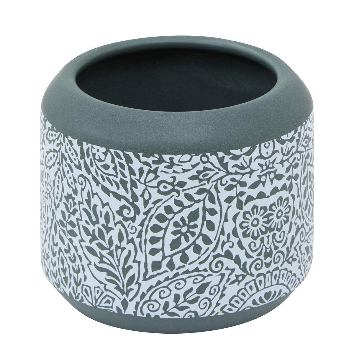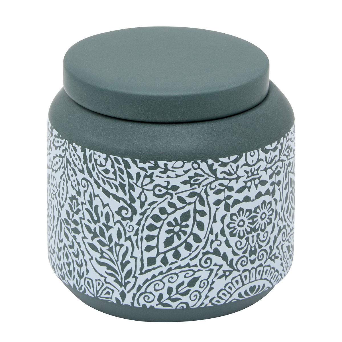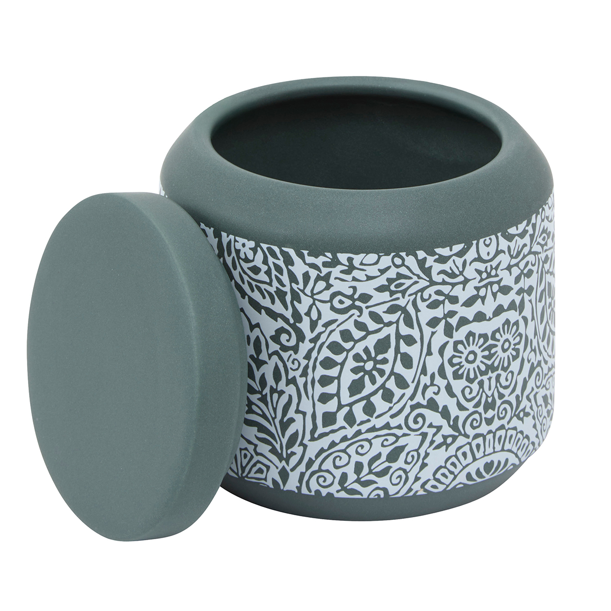 Βαμβακοθήκη με καπάκι και μοντέρνο σχεδιασμό. Είναι κατασκευασμένη από κεραμικό υλικό σε πράσινο χρώμα με λευκό φλοράλ σχέδιο. Ιδανική για να τοποθετήσετε δίσκους ντεμακιγιάζ, βαμβάκι ή μπατονέτες. Συνδυάστε τη με τα υπόλοιπα προϊόντα του ίδιου σετ για ένα ολοκληρωμένο αποτέλεσμα.