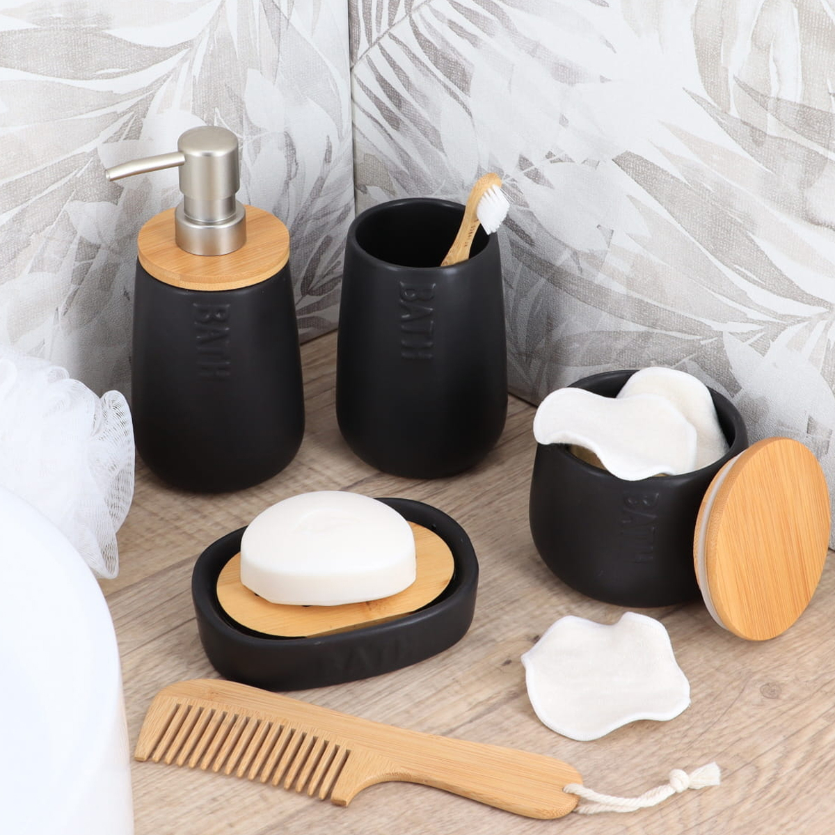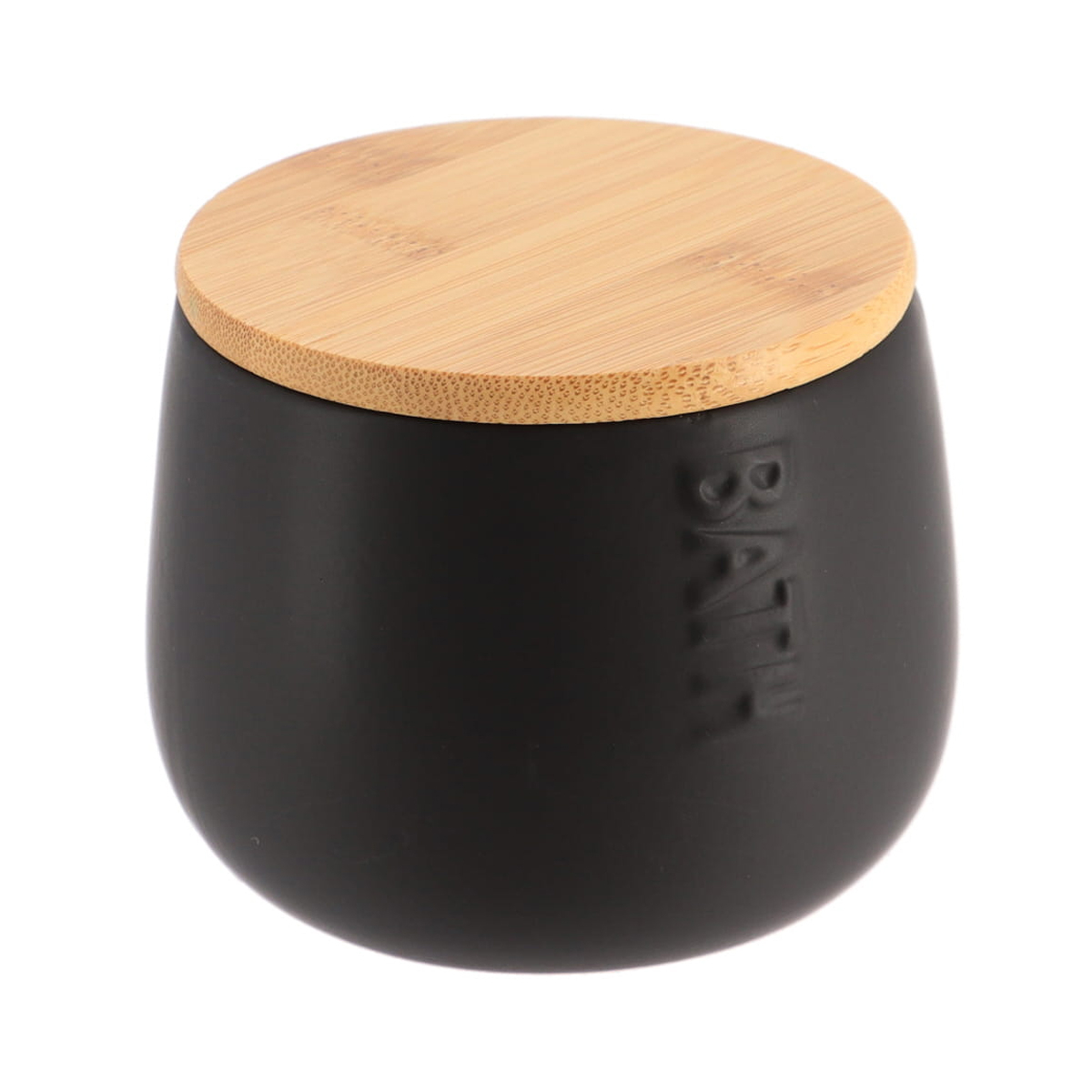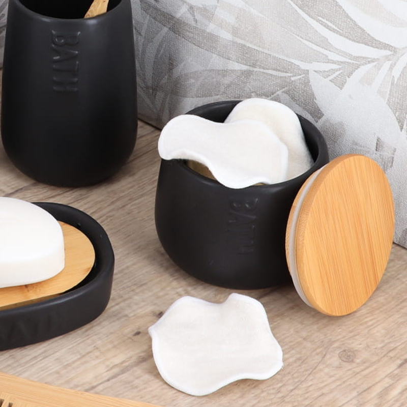 Δοχείο με καπάκι, για το βαμβάκι με μοντέρνο σχεδιασμό. Είναι κατασκευασμένο από κεραμικό υλικό σε μαύρο χρώμα με καπάκι από ξύλο bamboo σε φυσική απόχρωση. Ιδανικό για να κρατήσετε οργανωμένο το μπάνιο σας. Συνδυάστε το με τα υπόλοιπα προϊόντα του ίδιου σετ για ένα ολοκληρωμένο αποτέλεσμα.