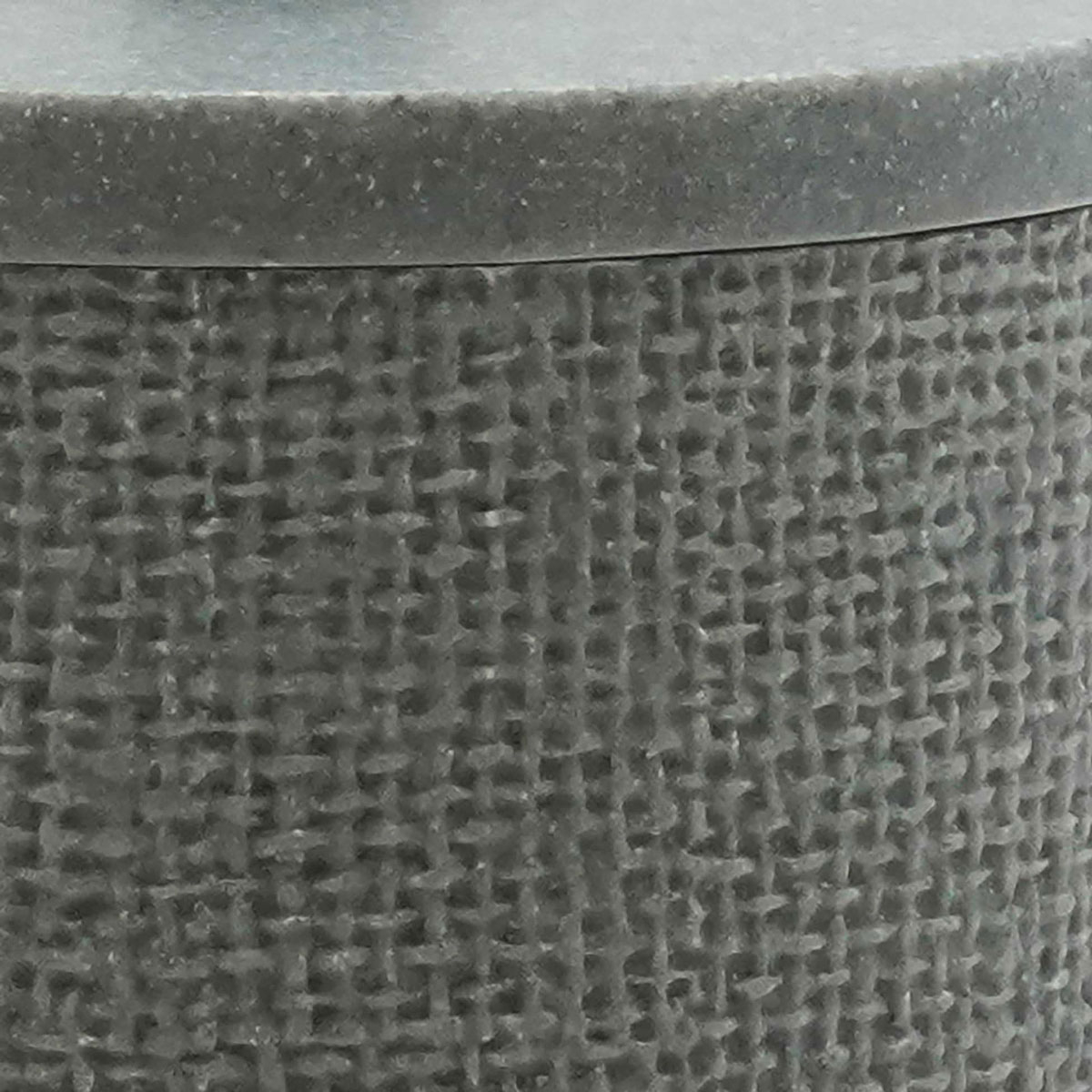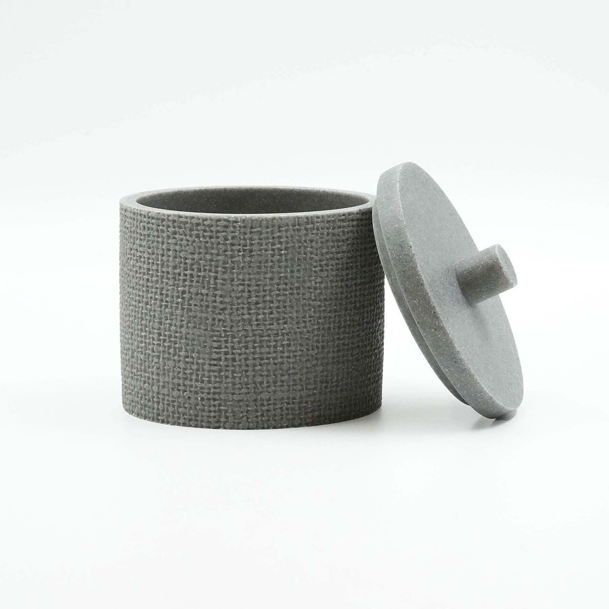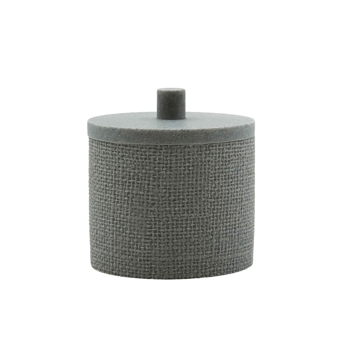 Βαμβακοθήκη με μοντέρνο σχεδιασμό. Το δοχείο είναι κατασκευασμένο από polyresin με όψη πλεκτού σε γκρι χρώμα. Ιδανικό για να τοποθετήσετε μέσα βαμβάκι ή ακόμη και δίσκους ντεμακιγιάζ διατηρώντας τον χώρο σας οργανωμένο και καλαίσθητο.