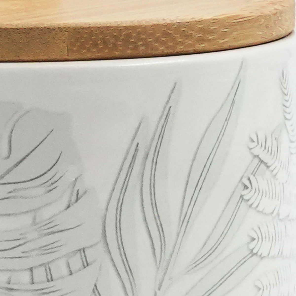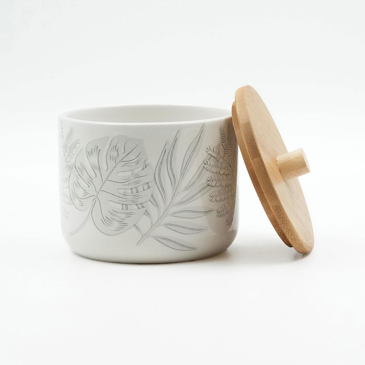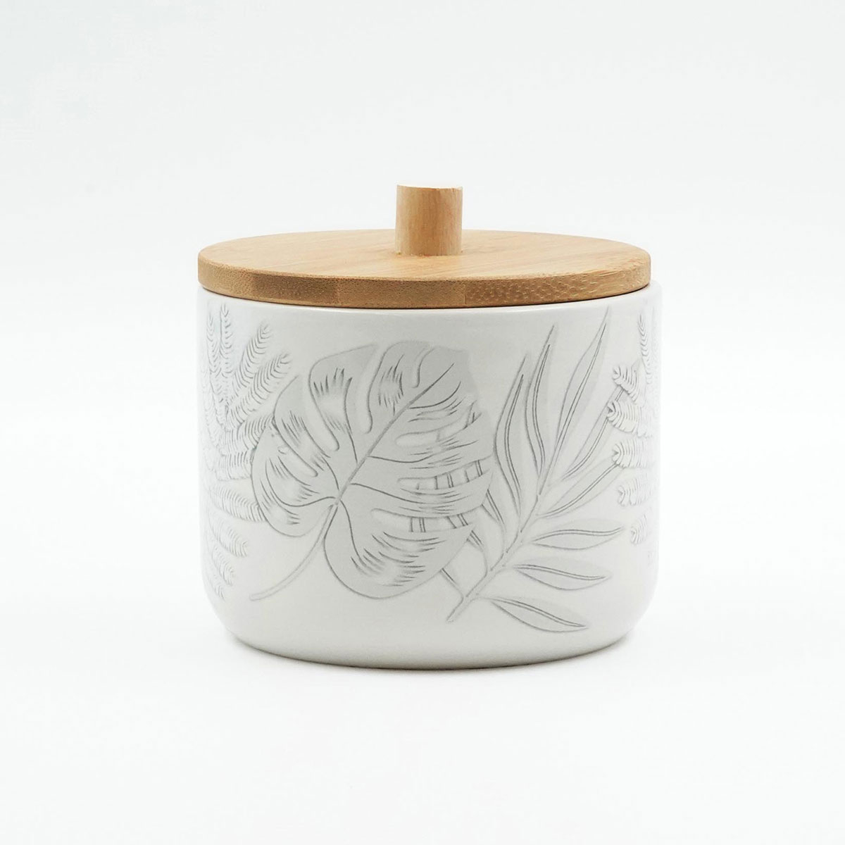 Βαμβακοθήκη με tropical σχέδιο σε γκρι αποχρώσεις. Το δοχείο είναι κατασκευασμένο από κεραμικό υλικό και το καπάκι από bamboo. Ιδανικό για να τοποθετήσετε μέσα βαμβάκι ή ακόμη και δίσκους ντεμακιγιάζ διατηρώντας τον χώρο σας οργανωμένο και καλαίσθητο.
