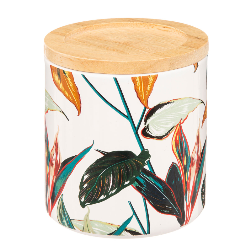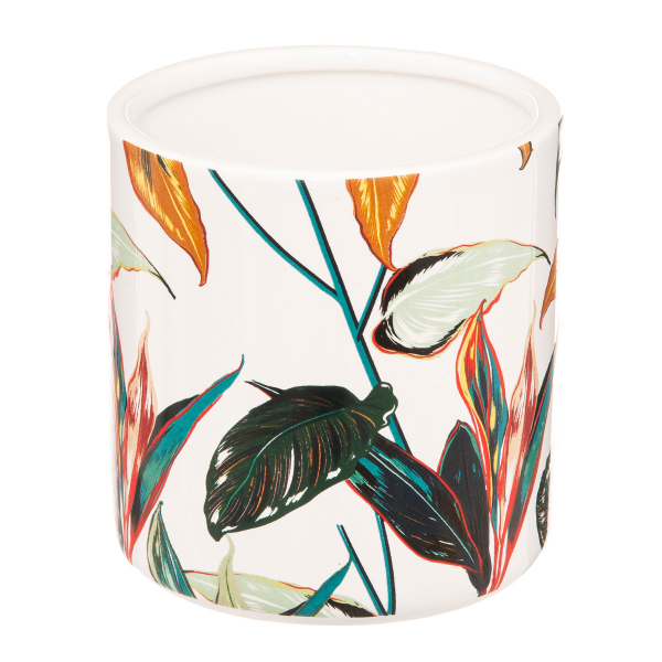 Βαμβακοθήκη με πολύχρωμο tropical σχέδιο σε λευκό φόντο και μπεζ καπάκι. Είναι κατασκευασμένη από κεραμικό υλικό ενώ το καπάκι από ξύλο bamboo. Μπορείτε να τοποθετήσετε μέσα βαμβάκι ή ακόμη και δίσκους ντεμακιγάζ. Συνδυάστε τη με τα υπόλοιπα προϊόντα του ίδιου σετ για ένα ολοκληρωμένο αποτέλεσμα.