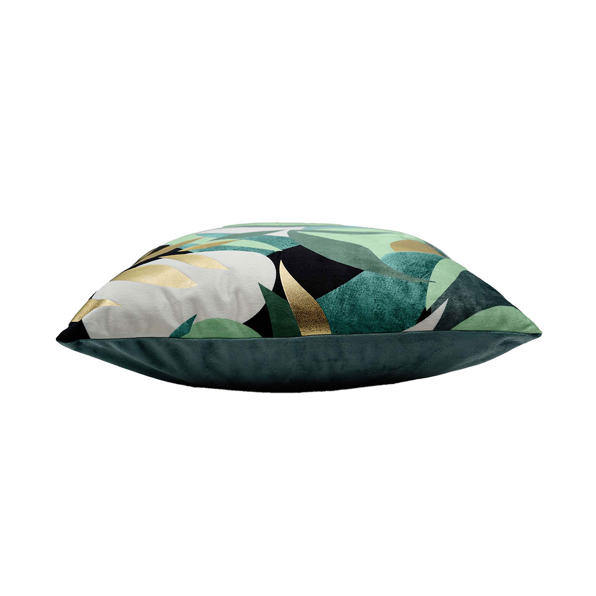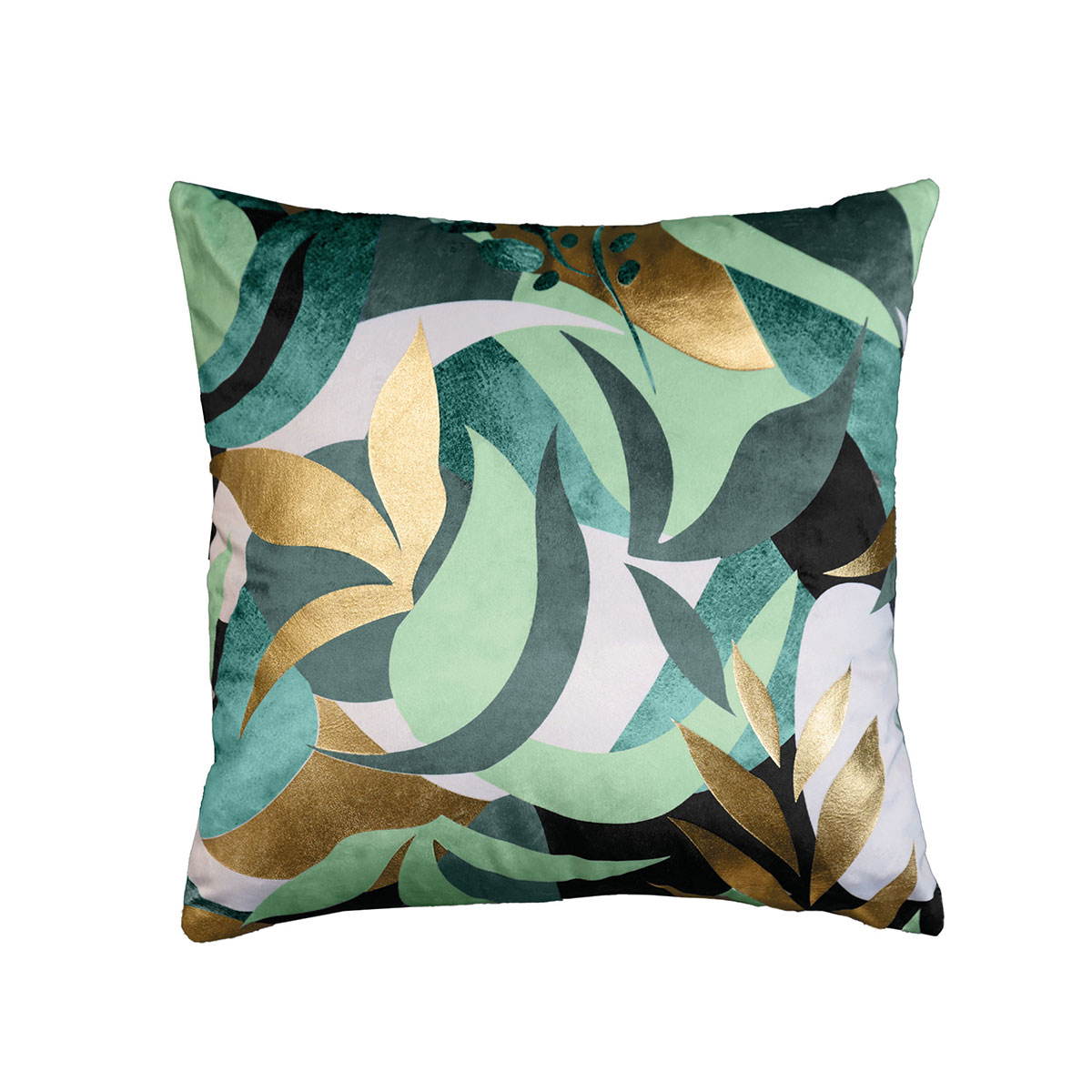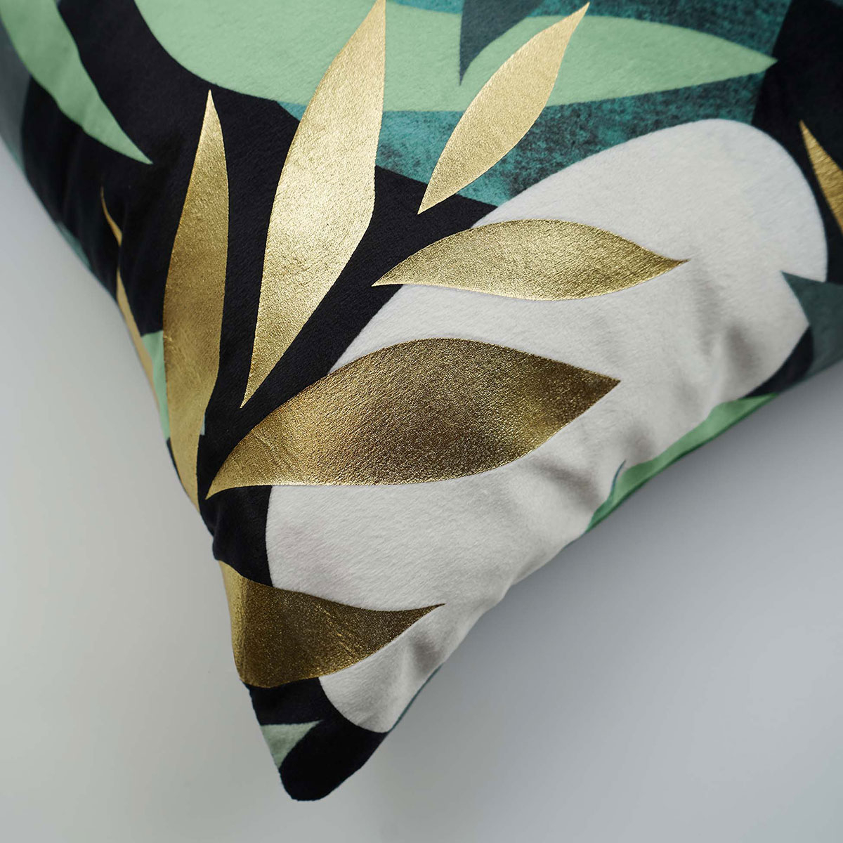 Βελουτέ μαξιλαροθήκη με tropical σχέδιο σε πράσινες αποχρώσεις και λευκές-χρυσές-μαύρες λεπτομέρειες. Η σύνθεση του υφάσματος είναι 100% polyester. Διαθέτει κλείσιμο με φερμουάρ. Συνδυάστε την με την υπόλοιπη διακόσμησή σας για να δώσετε μοναδική όψη στον χώρο σας.