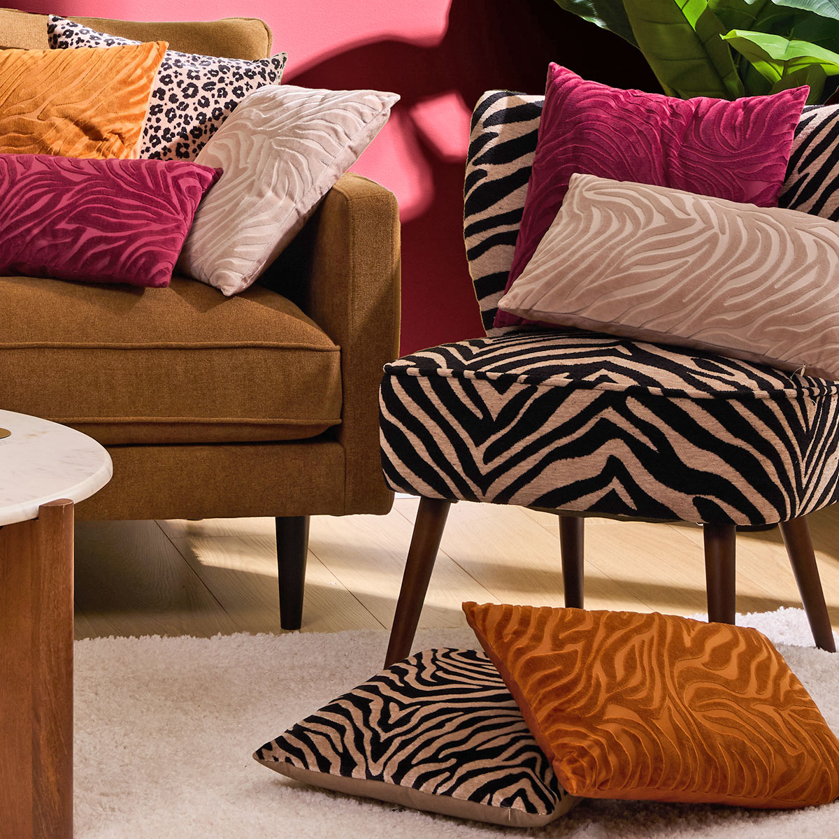 Βελουτέ διακοσμητικό μαξιλάρι διπλής όψης. Η μια πλευρά έχει ανάγλυφο animal print σχέδιο στο χρώμα της τερακότας, ενώ η άλλη είναι μονόχρωμη βελουτέ στο χρώμα της ώχρας. Το εξωτερικό ύφασμα είναι από 100% polyester, ενώ το εσωτερικό γέμισμα είναι πολυεστερική βάτα. Διαθέτει φερμουάρ για να αφαιρείται και να πλένεται. Ανανεώστε εύκολα τον χώρο του σπιτιού σας, δίνοντας μια φρέσκια και ανάλαφρη διάθεση. Ιδανικό για τους χειμερινούς μήνες του χρόνου. Συνδυάστε το με τα υπόλοιπα προϊόντα της ίδιας σειράς για ένα ολοκληρωμένο αποτέλεσμα στο χώρο σας.